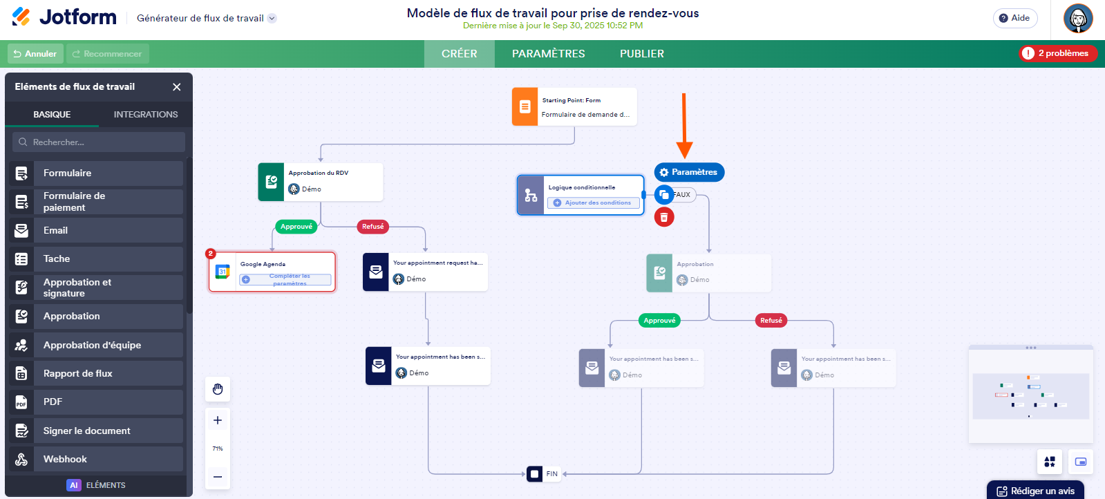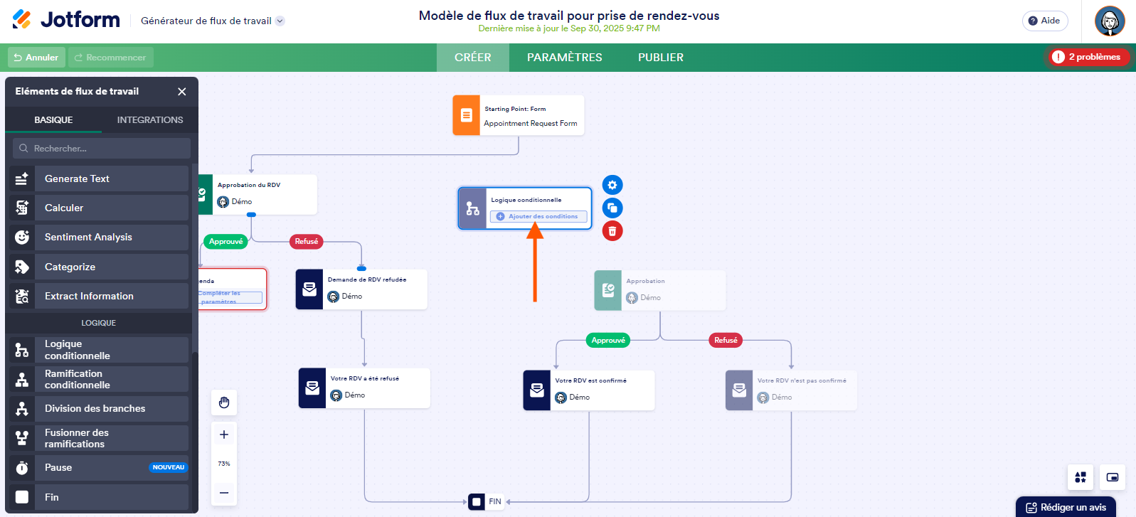 Pour commencer à utiliser l’élément Logique conditionnelle dans votre flux de travail, suivez ces étapes simples :