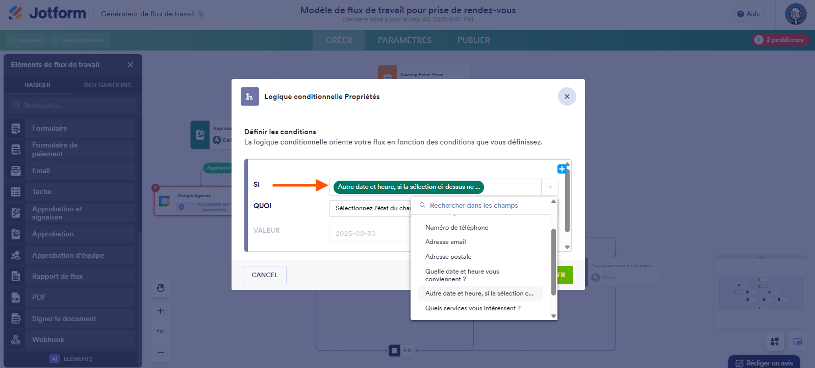 - Dans le volet Propriétés de la logique conditionnelle à droite, sélectionnez un champ de formulaire inclus dans votre flux de travail comme valeur pour « Si ».