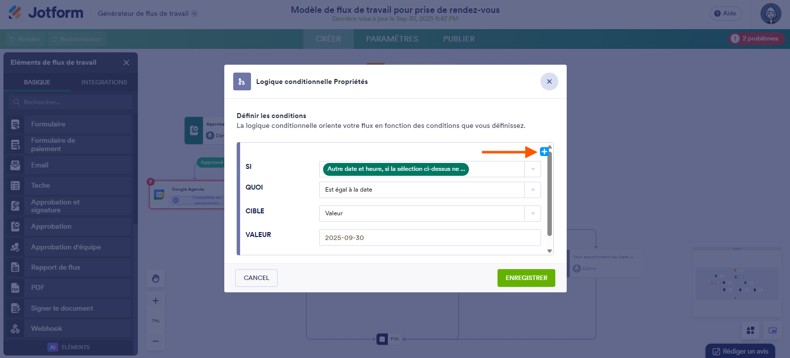 Pour ajouter plusieurs conditions à la Logique conditionnelle et rendre votre flux de travail plus dynamique, cliquez sur l’icône Plus située sur la condition la plus haute dans la fenêtre modale Propriétés de la logique conditionnelle. Cela vous permet de définir des critères supplémentaires qui doivent être remplis pour que le flux de travail suive un chemin particulier.