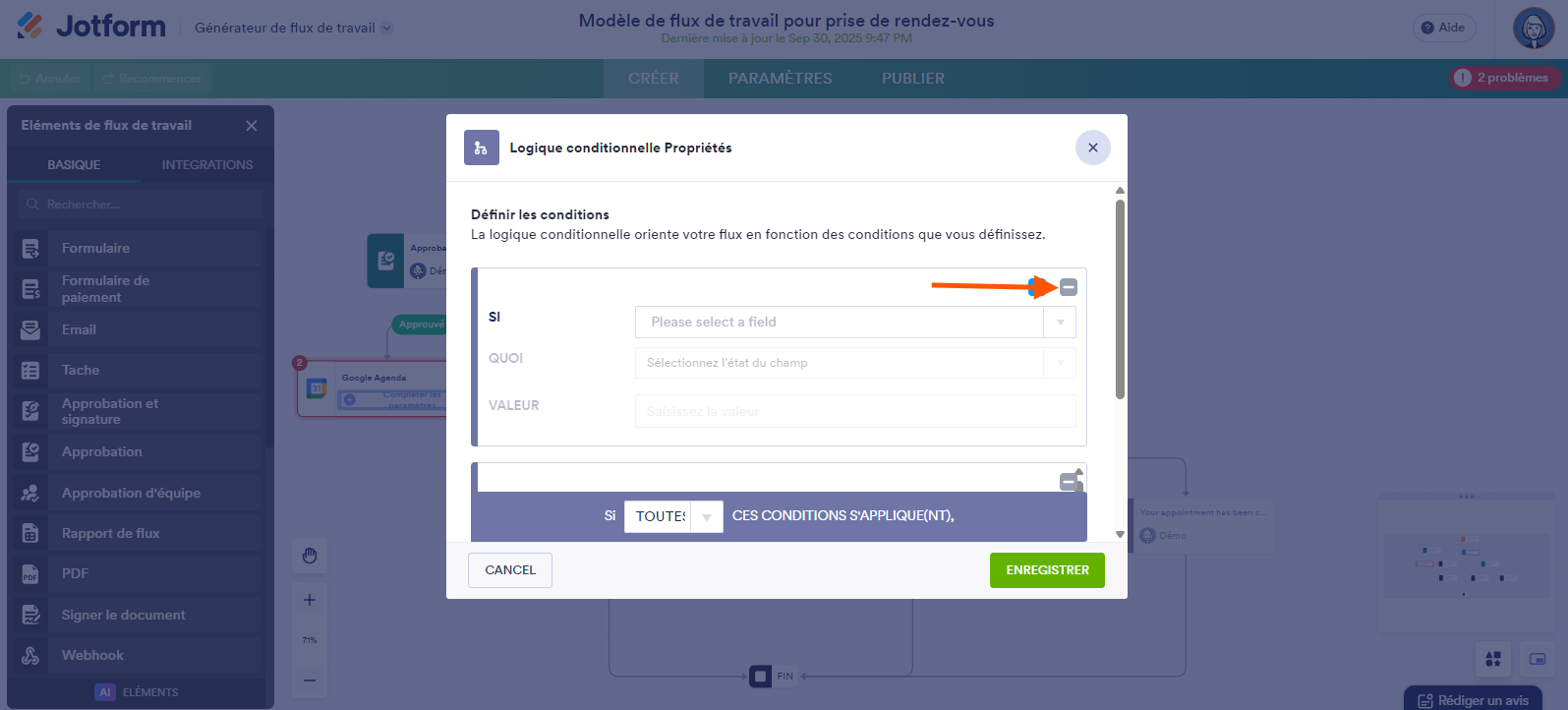 Si certaines conditions ne sont plus pertinentes, vous pouvez les supprimer en cliquant sur l’icône Moins, qui apparaît sur chaque condition lorsqu’il y en a plus d’une dans la fenêtre modale Propriétés de la logique conditionnelle afin de garder votre flux de travail précis et aligné avec vos besoins.