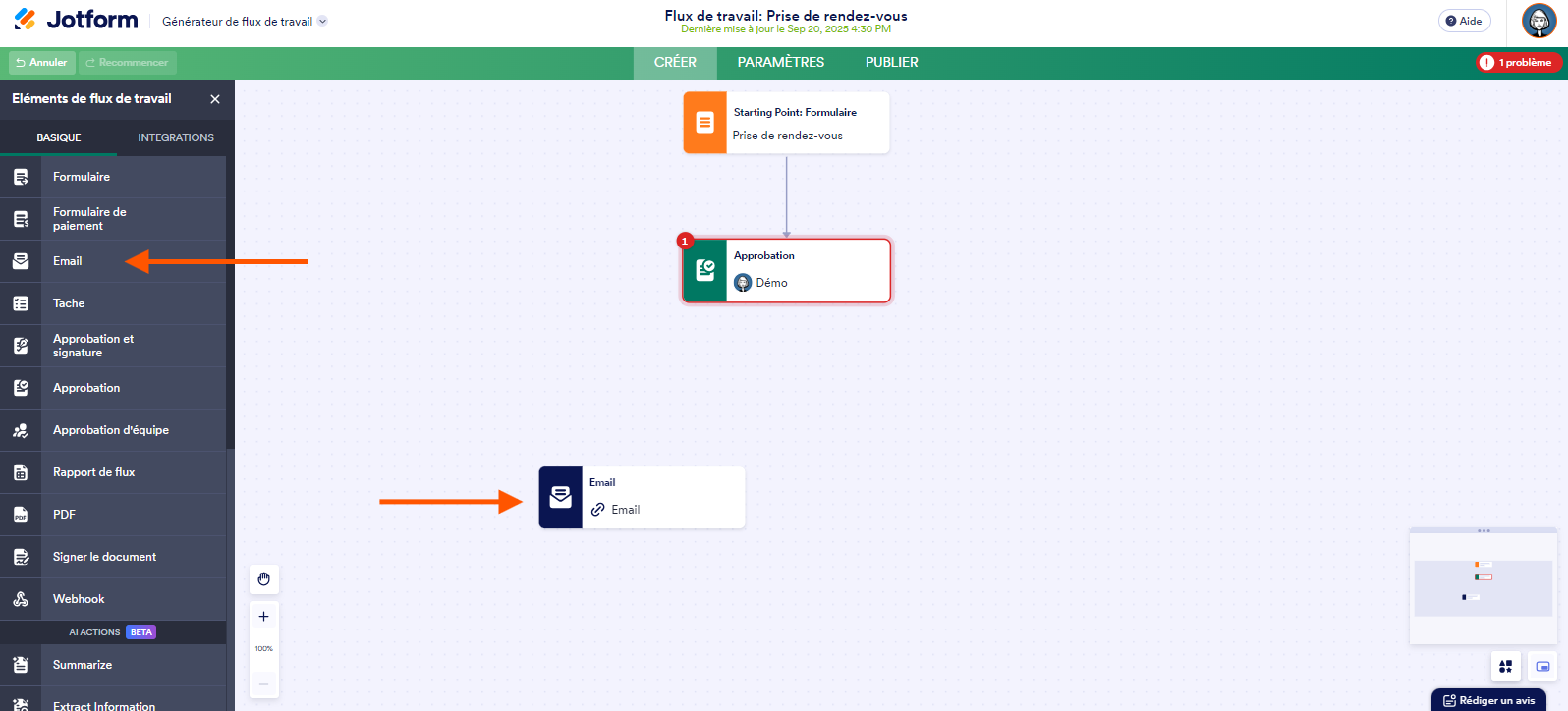 - Sous l’onglet Basique, glissez-déposez ou cliquez sur l’élément Email pour l’ajouter à votre flux de travail.