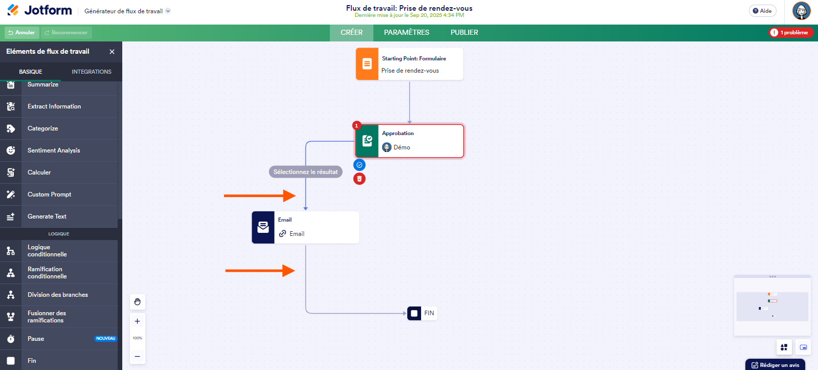 - Ensuite, dessinez une ligne de flux reliant l’élément Email à l’élément Approbation et une autre le reliant à un élément Fin. Consultez notre guide Comment ajouter et connecter des éléments dans les Flux de travail Jotform pour en savoir plus.