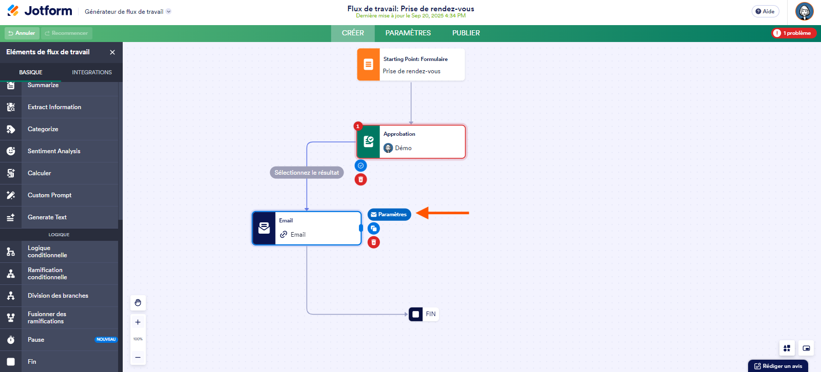 Un élément Email sera automatiquement ajouté à votre flux de travail lorsqu’un champ Email est présent dans votre formulaire.