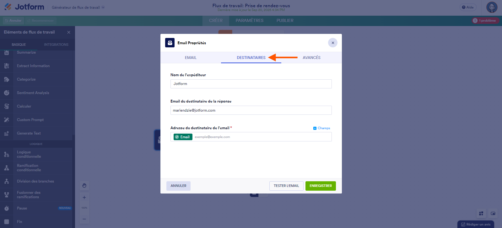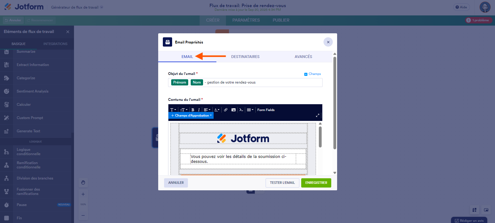Une fenêtre modale Propriétés de l’élément Email s’affiche alors. Elle contient trois onglets : Email, Destinataires et Avancé.