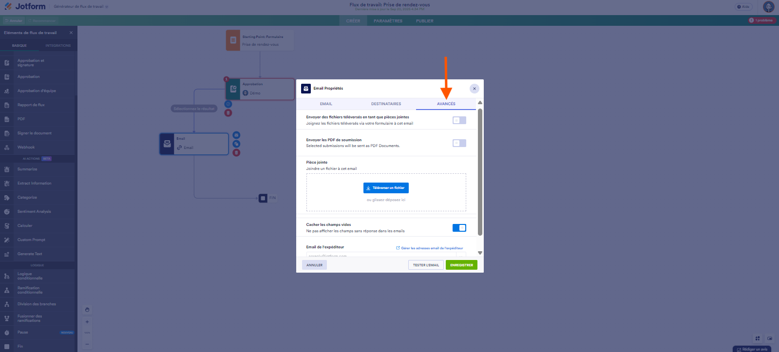 Dans l’onglet Avancé, vous pouvez configurer les options de pièces jointes pour l’élément Email de votre flux de travail. Vous pouvez également masquer automatiquement les champs de formulaire vides dans le contenu de l’email et définir votre adresse email d’expéditeur préférée.