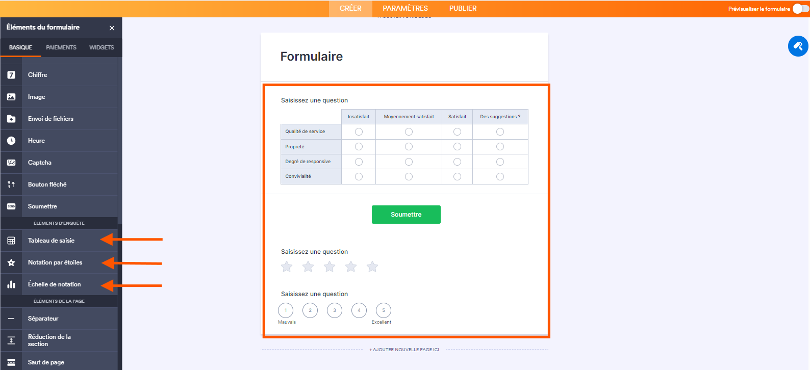 Pour créer une enquête engageante et efficace, commencez par ajouter des champs d’enquête pertinents tels qu’un tableau de saisie, une évaluation par étoiles et une évaluation par échelle. Voici comment procéder :