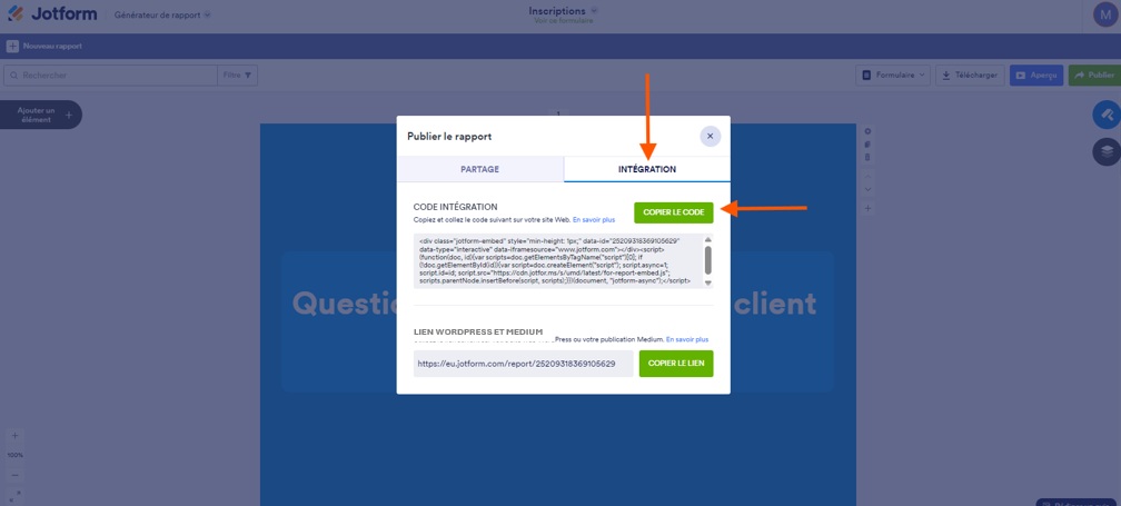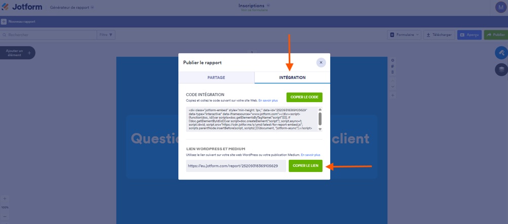 - Accédez à l’onglet Intégration de la fenêtre contextuelle Publier le rapport.