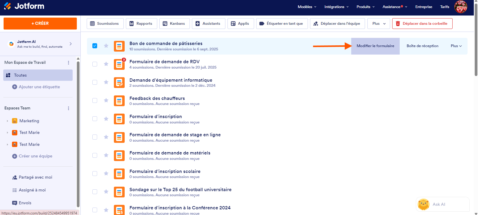 - Accédez à Mes Formulaires dans le Générateur de formulaires Jotform et repérez votre formulaire contenant plusieurs options de mode de paiement. Sélectionnez-le, puis cliquez sur Modifier le formulaire à droite afin d’y apporter des modifications.