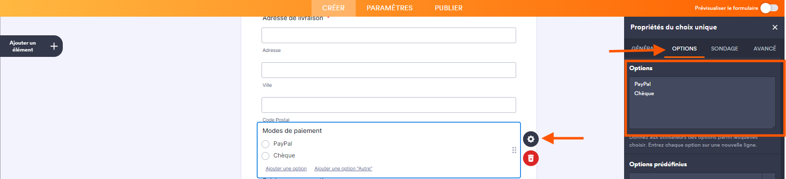 - Dans le formulaire, accédez au champ Modes de paiement et cliquez sur l’icône d’engrenage pour ouvrir le volet Propriétés du choix unique, puis sur l’onglet Options si vous souhaitez modifier les modes de paiement ou en ajouter un autre.