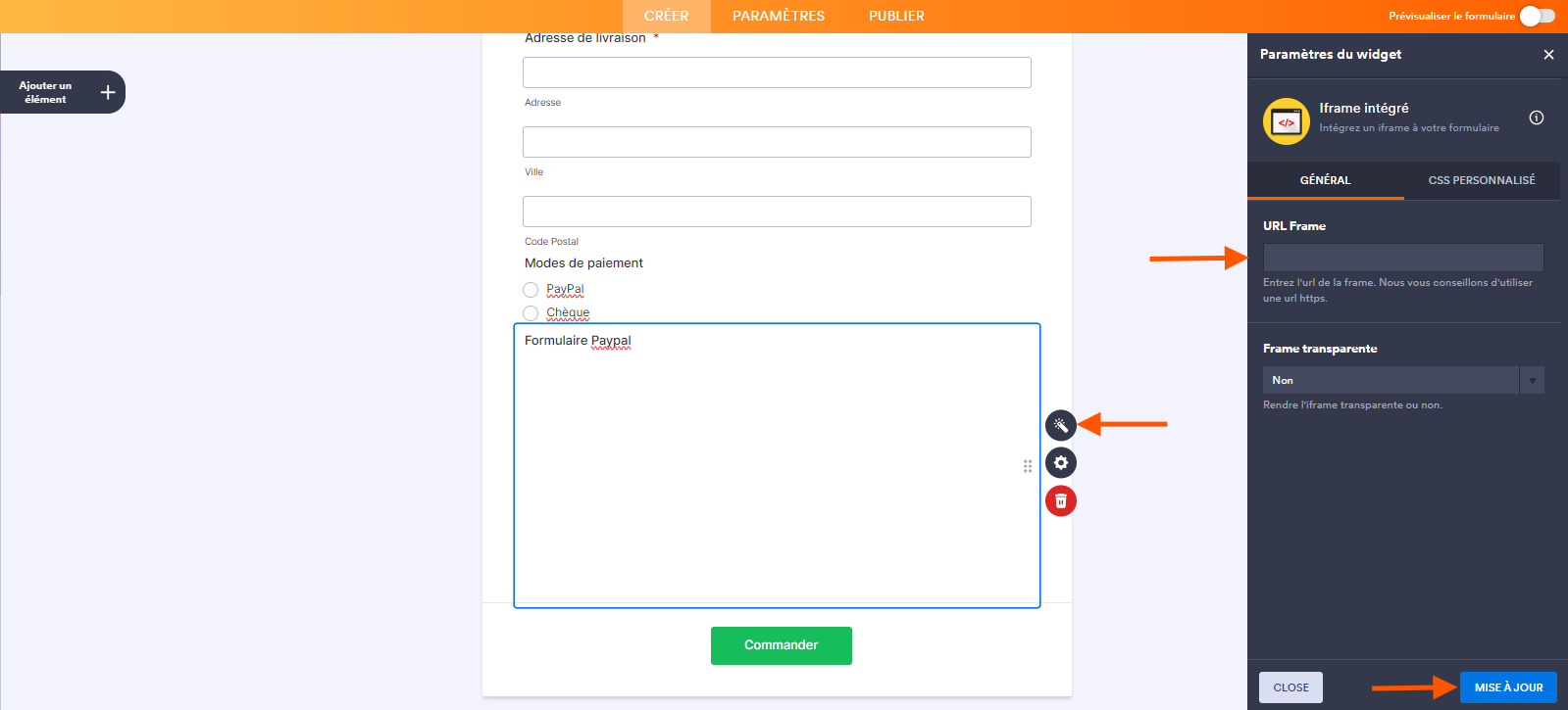 - Pour changer le formulaire de paiement intégré, ouvrez le volet de configuration du widget Iframe intégré en cliquant sur son icône de baguette, mettez à jour l’URL Frame et appuyez sur le bouton Mise à jour.