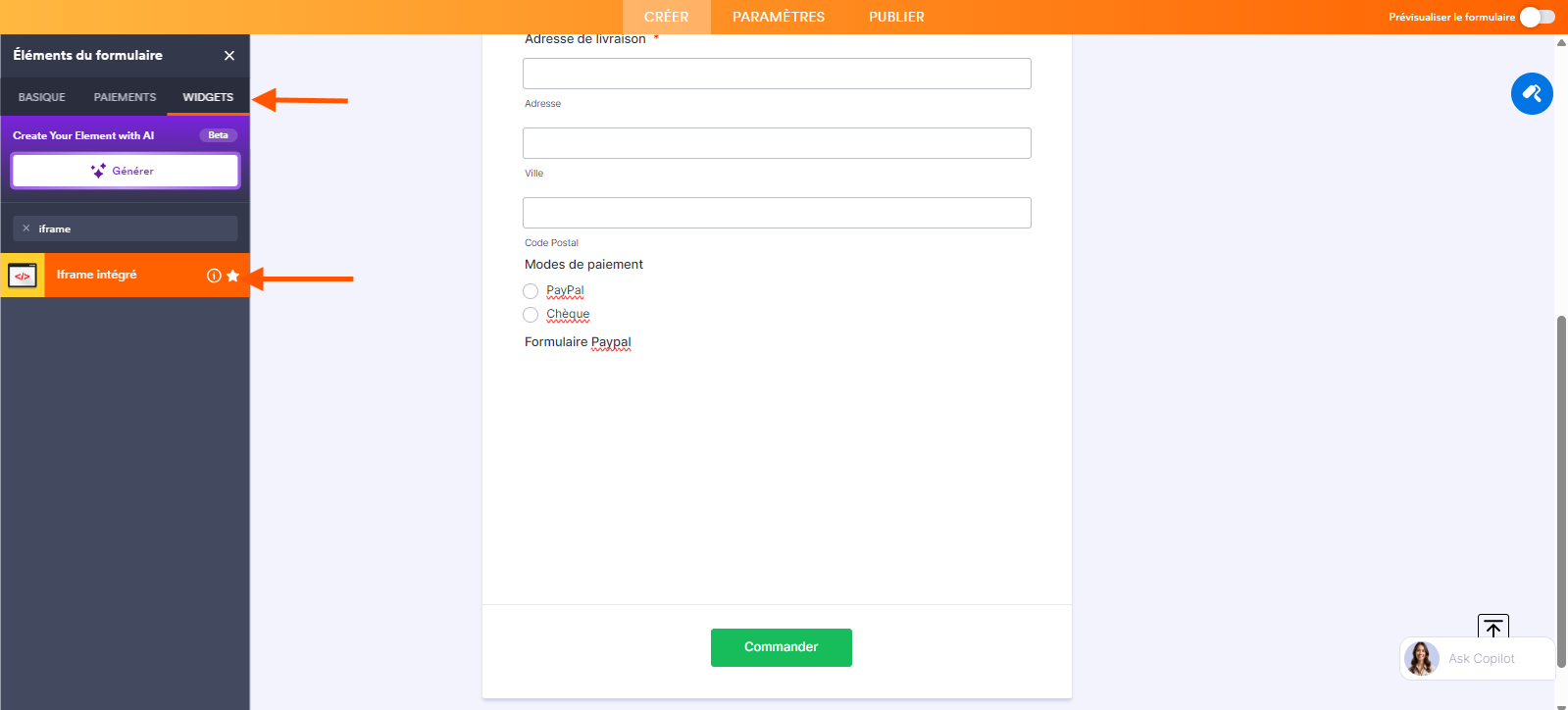 Pour intégrer un nouveau formulaire de paiement, utilisez un nouveau widget Iframe intégré. Par glisser-déposer, ajoutez-le dans le formulaire et configurez-en les paramètres.