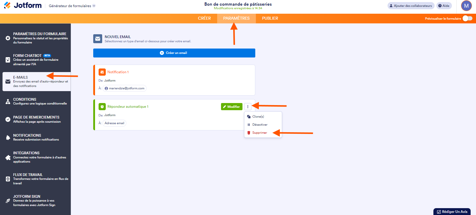 Pour supprimer une notification par email ou une réponse automatique par email de votre formulaire, procédez comme suit :