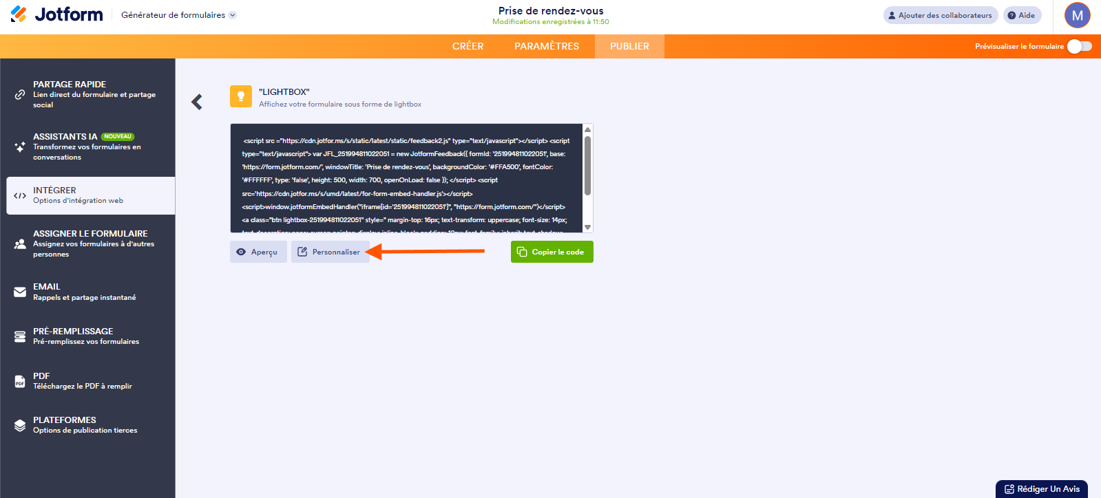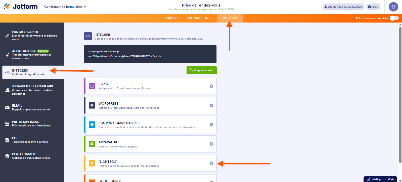 Obtenir les codes d’intégration Lightbox