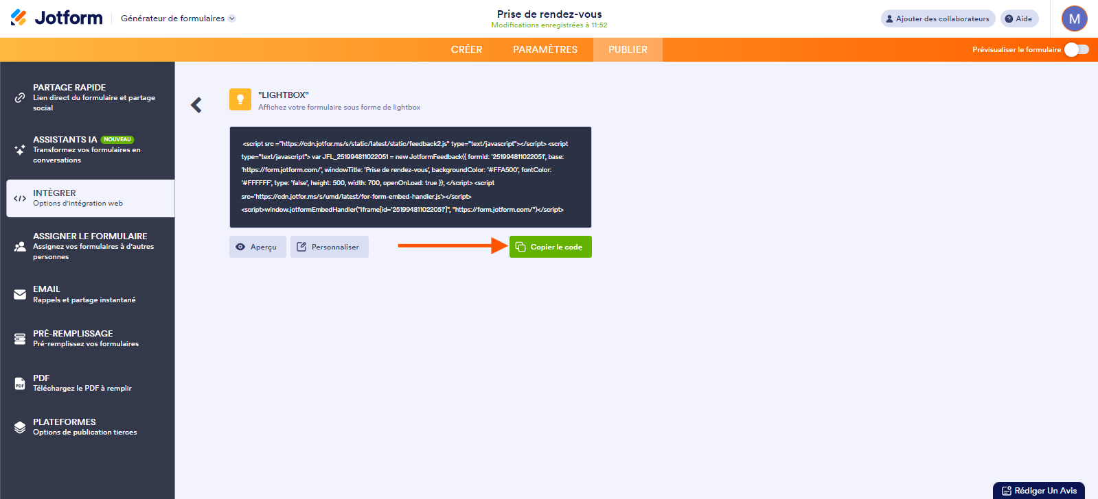 - Enfin, cliquez sur le bouton Copier le code sur l’écran suivant pour l’intégrer sur votre page web.
