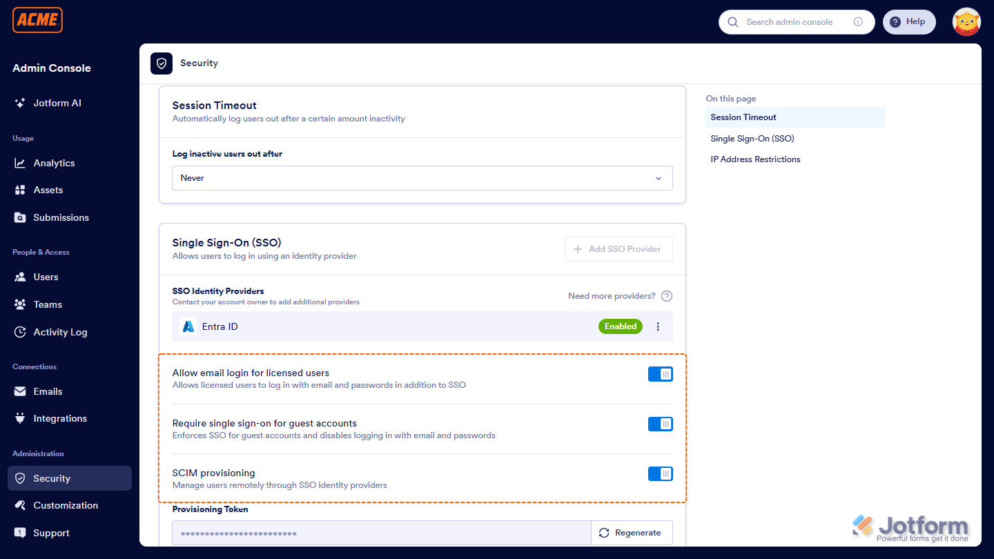 With Jotform Enterprise, you can enable Single Sign-On (SSO) so users can log in using your organization’s existing credentials. This streamlines access management and adds an extra layer of security. Users only need one set of login details, reducing password-related issues and making sign-in faster and more convenient.