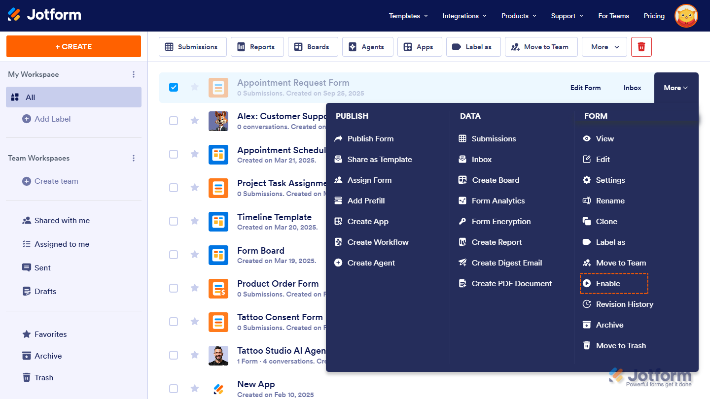 Enabling or disabling a form through your Workspace page is easy. Let’s do it: