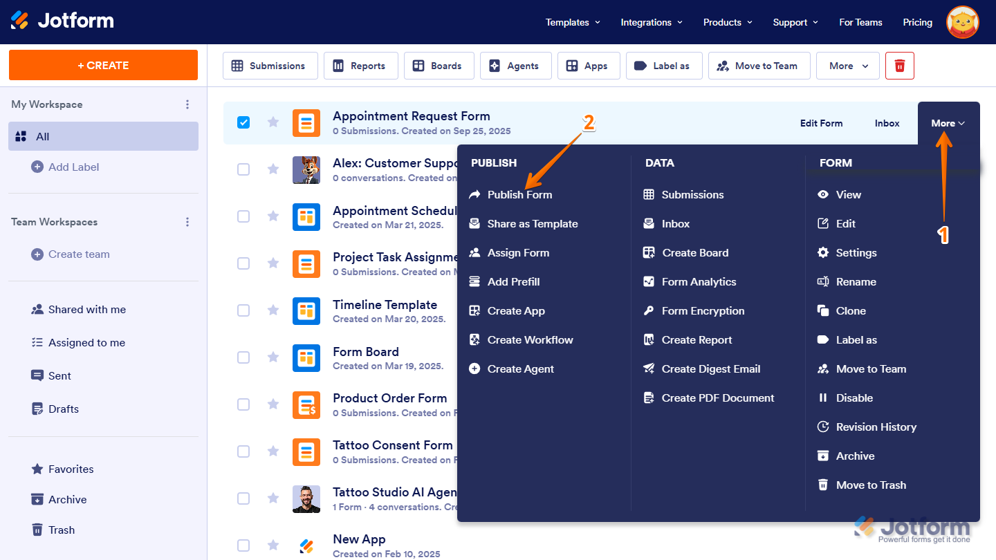 - On your My Workspace page, hover your mouse over the form and click on More on the right side of the screen.