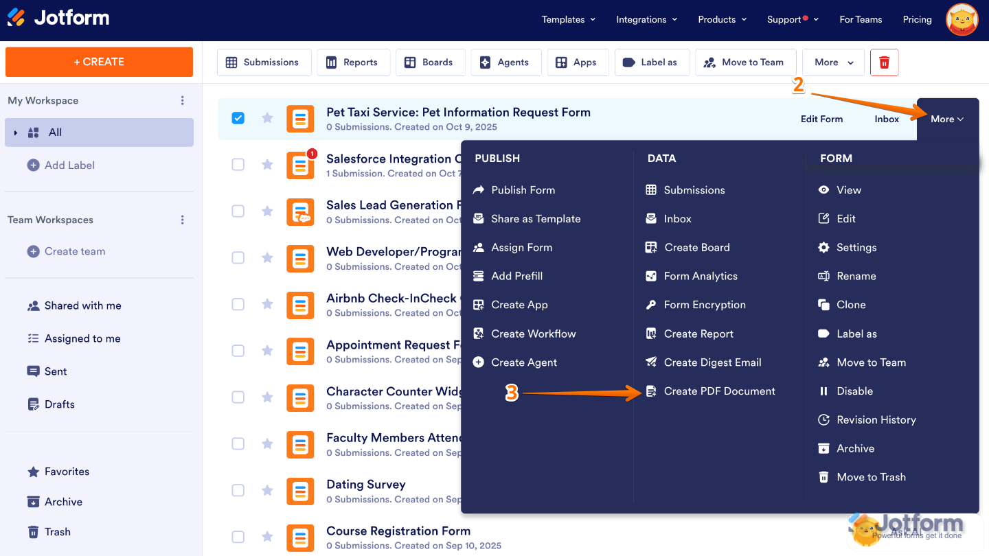 - Then, in the Dropdown menu, under the Data column, click on Create PDF Document. You’ll see Open PDF Editor instead if your form had at least one PDF Document created for it previously.