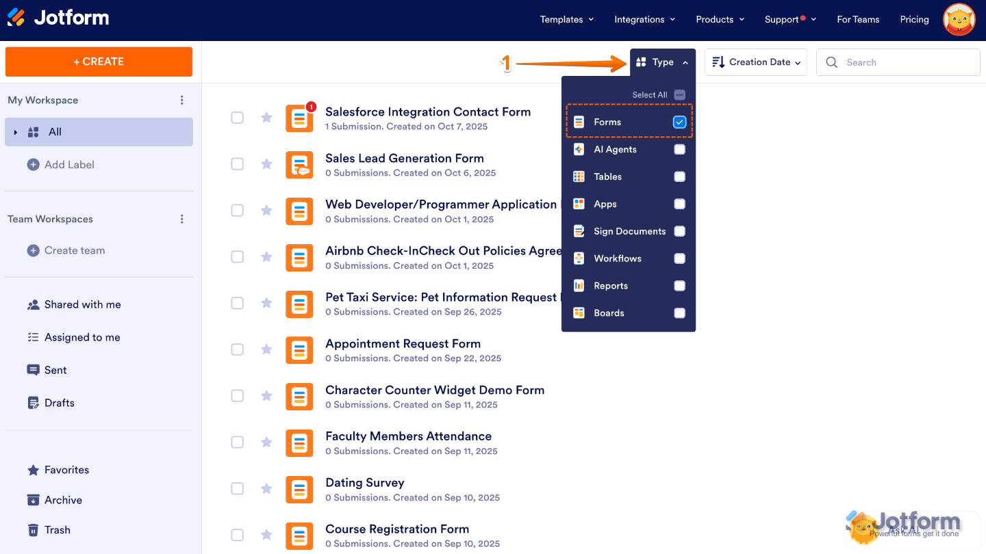 - On your My Workspace page, click on Type at the top and in the Dropdown menu that opens, uncheck the boxes next to all the assets except Forms, so only they’ll be shown on the page.