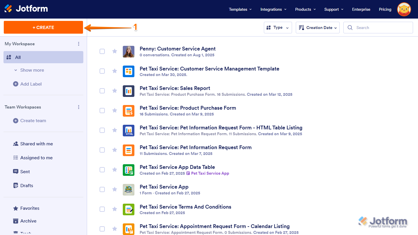- On your Workspace page, click on Create on the top-left side of the screen.