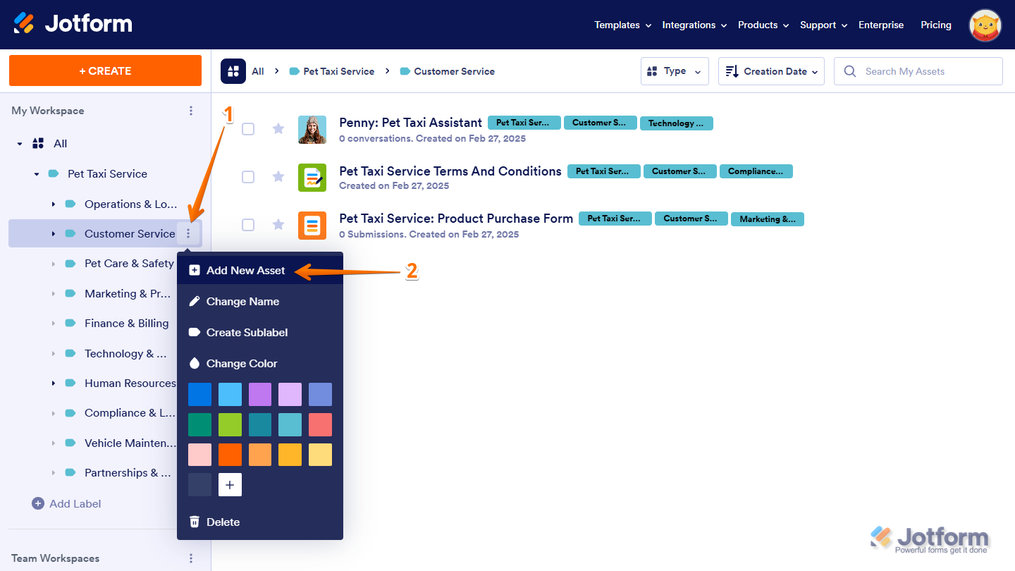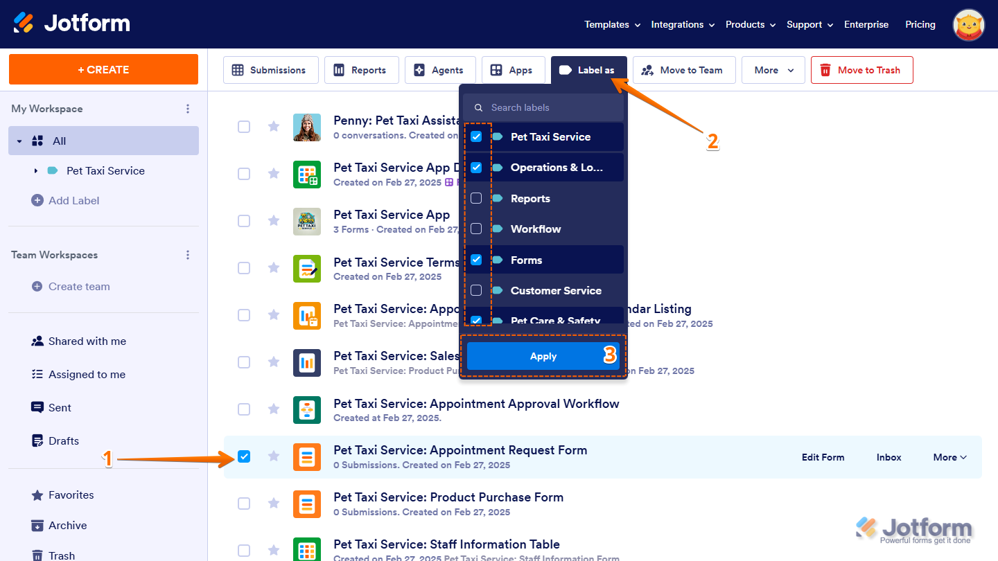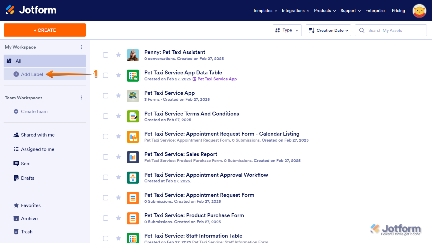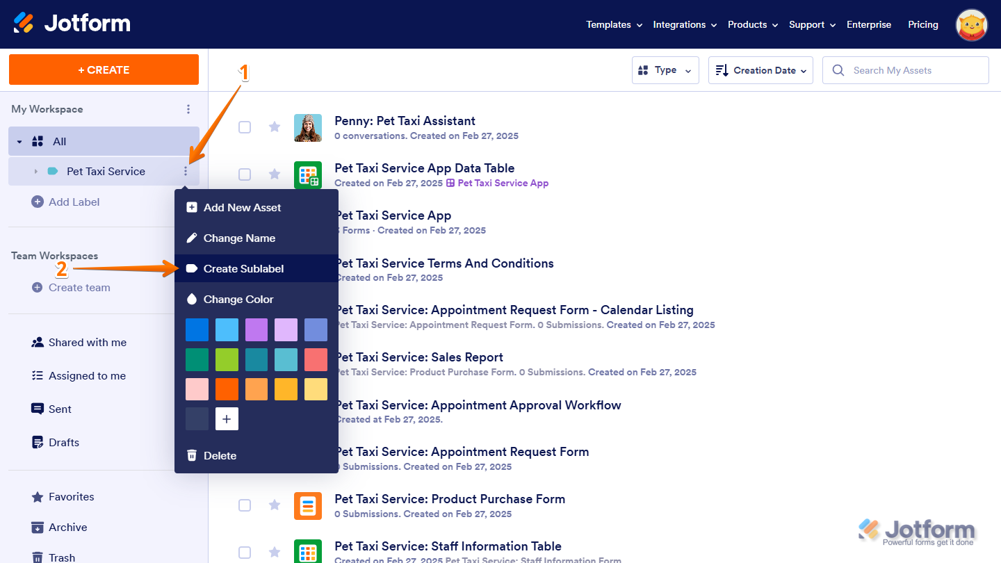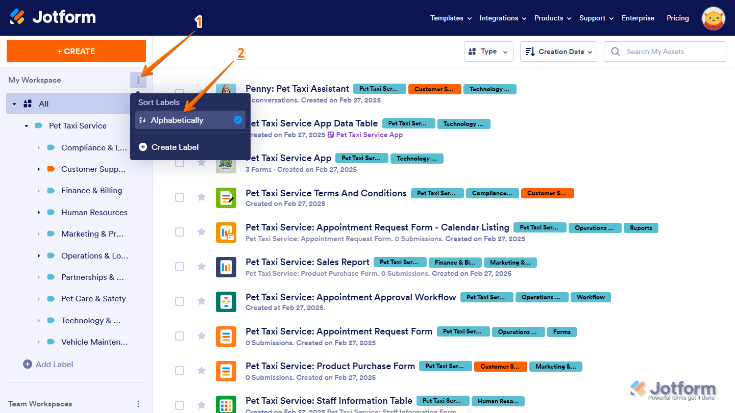 Labels help you organize workspace assets by categorizing them, making it easier to find and manage what you need. Instead of scrolling through a long list, you can filter and access Forms, AI Agents, Workflows, Apps, Sign Documents, Tables, and Reports based on their assigned labels. As your workspace grows, labels keep everything structured, helping you sort assets into meaningful groups. You can create sublabels for more detailed organization, customize labels to fit your workflow, and sort them alphabetically for easier navigation. Since labeled assets remain flexible, you can update or reassign them anytime to keep your workspace organized.
