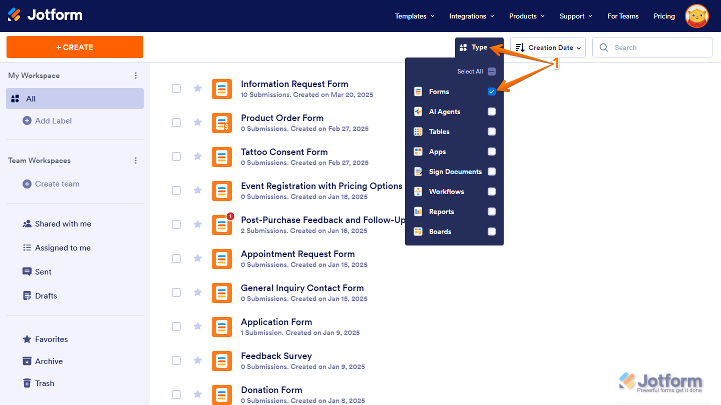 - On your My Workspace page, click on Type at the top and in the Dropdown menu that opens, uncheck the boxes next to all the assets except Forms, so only they’ll be shown on the page.