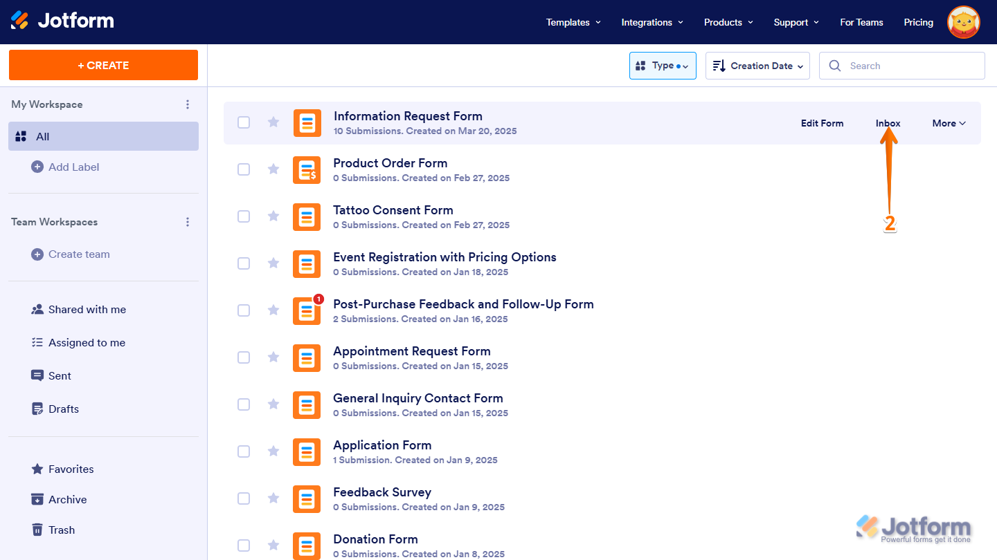 - Now, hover your mouse over the form you want to archive submissions for and click on Inbox on the right side of the page.