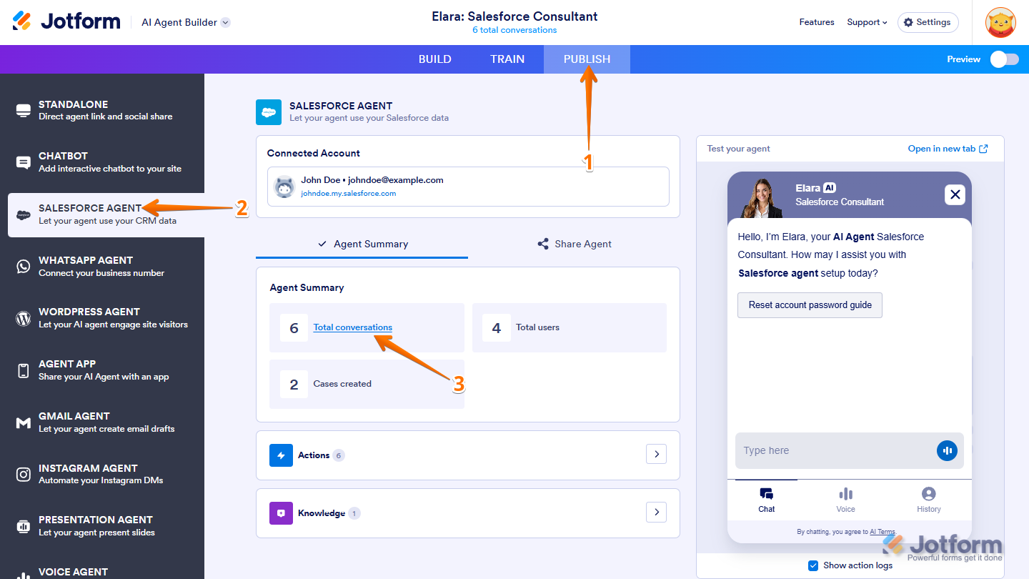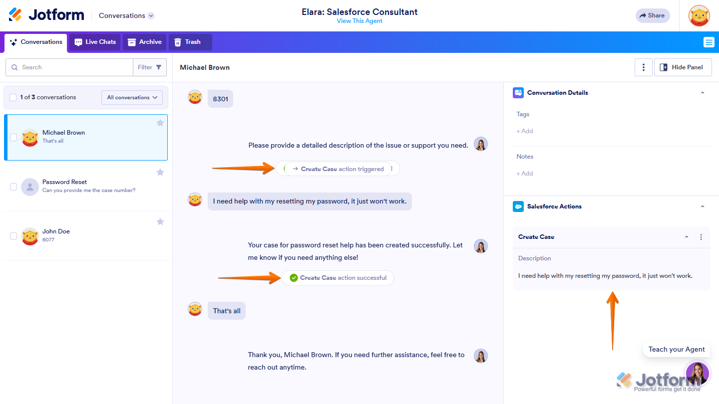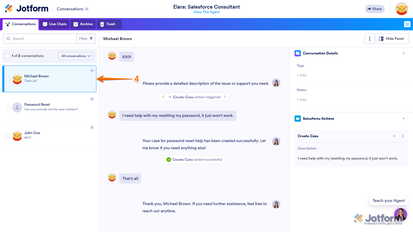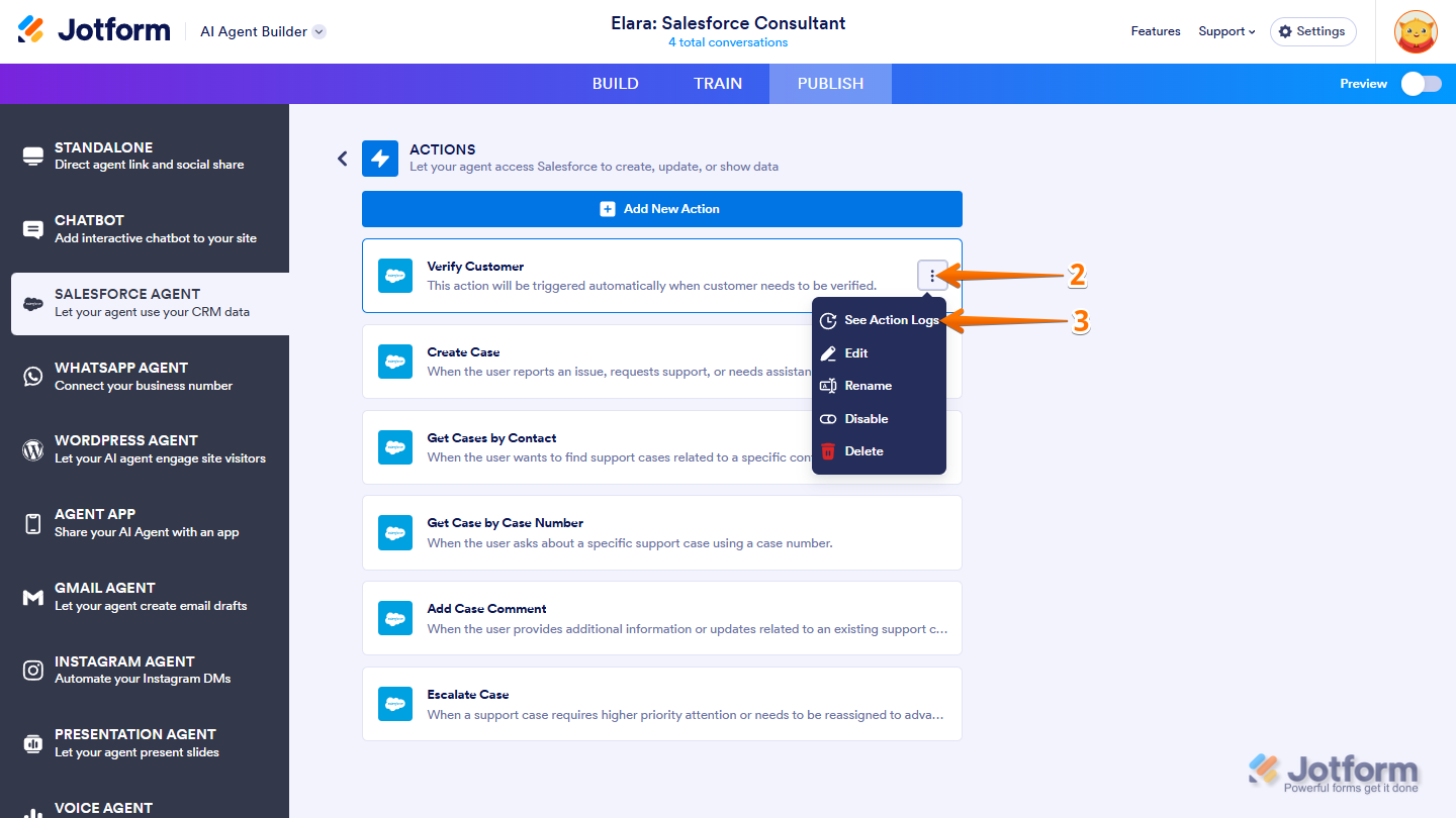 Jotform makes it easy to view your Salesforce Agent’s activity directly from the conversation page. With Integration Logs, you can monitor every interaction between your Agent and Salesforce—from successful data transfers to failed sync attempts.