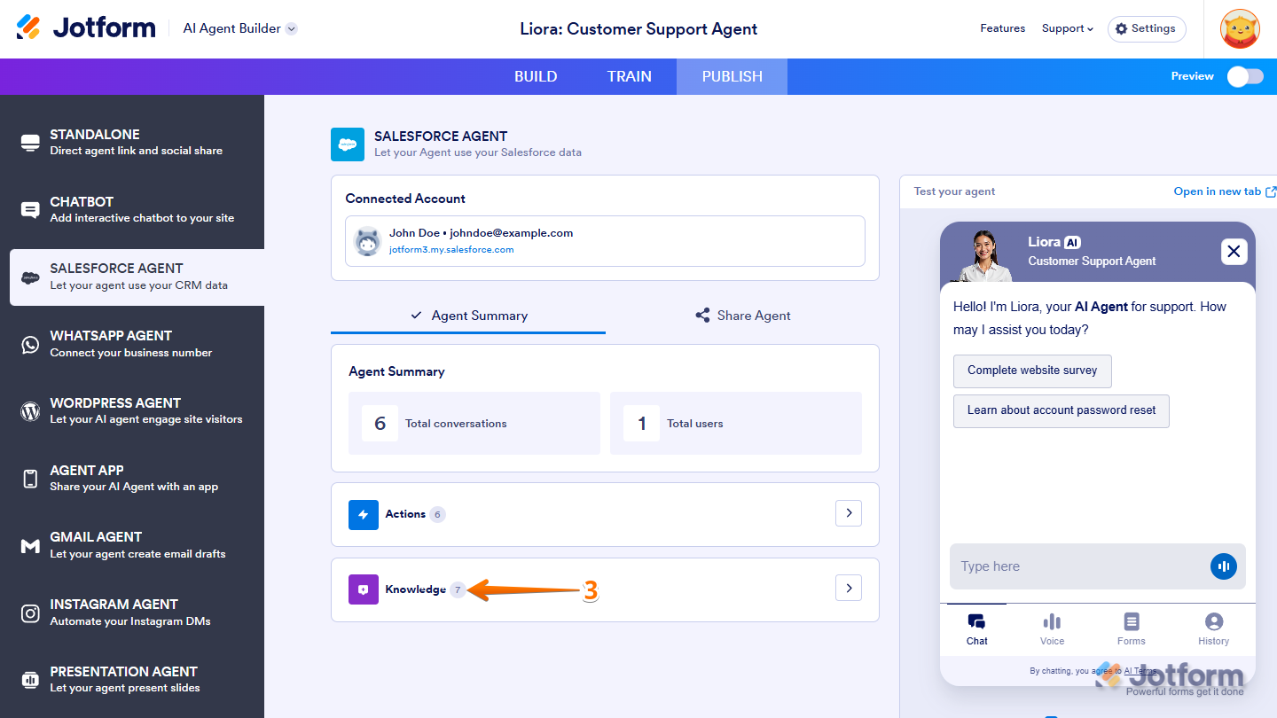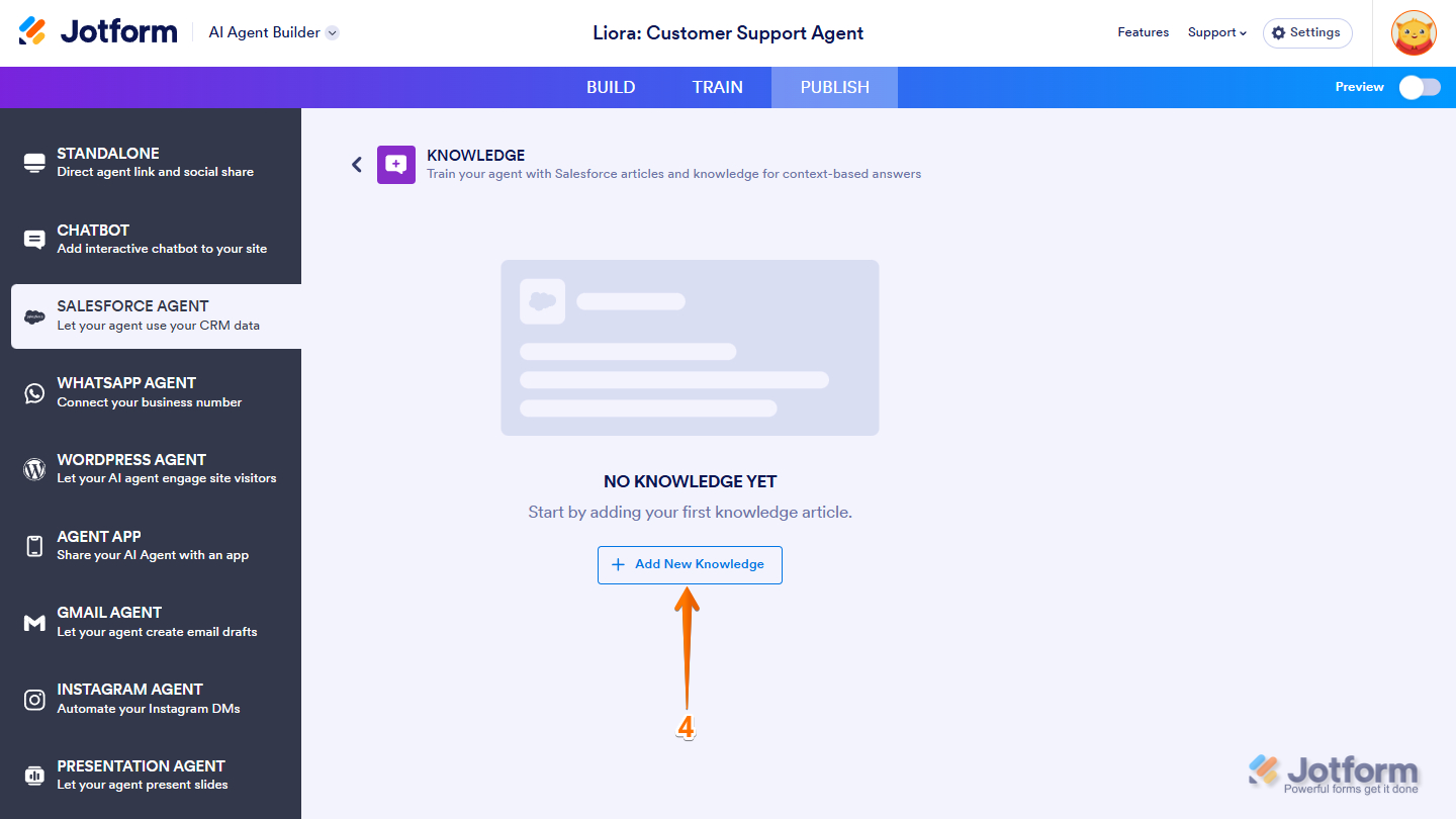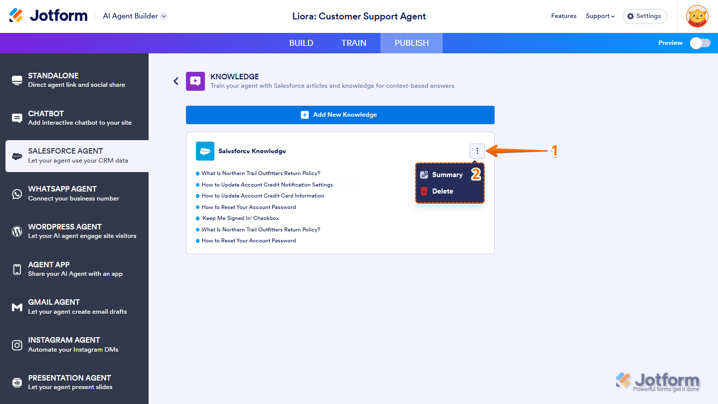 Jotform’s Salesforce Agent is designed for teams that rely on Salesforce as their main Customer Relationship Management (CRM) or support platform and want to get more done with AI automation. Think of it as adding a new teammate who’s always ready with the right answers. By training your Agent with Salesforce articles and knowledge, you can instantly deliver accurate, helpful responses during conversations—no more digging through articles or copy-pasting replies.