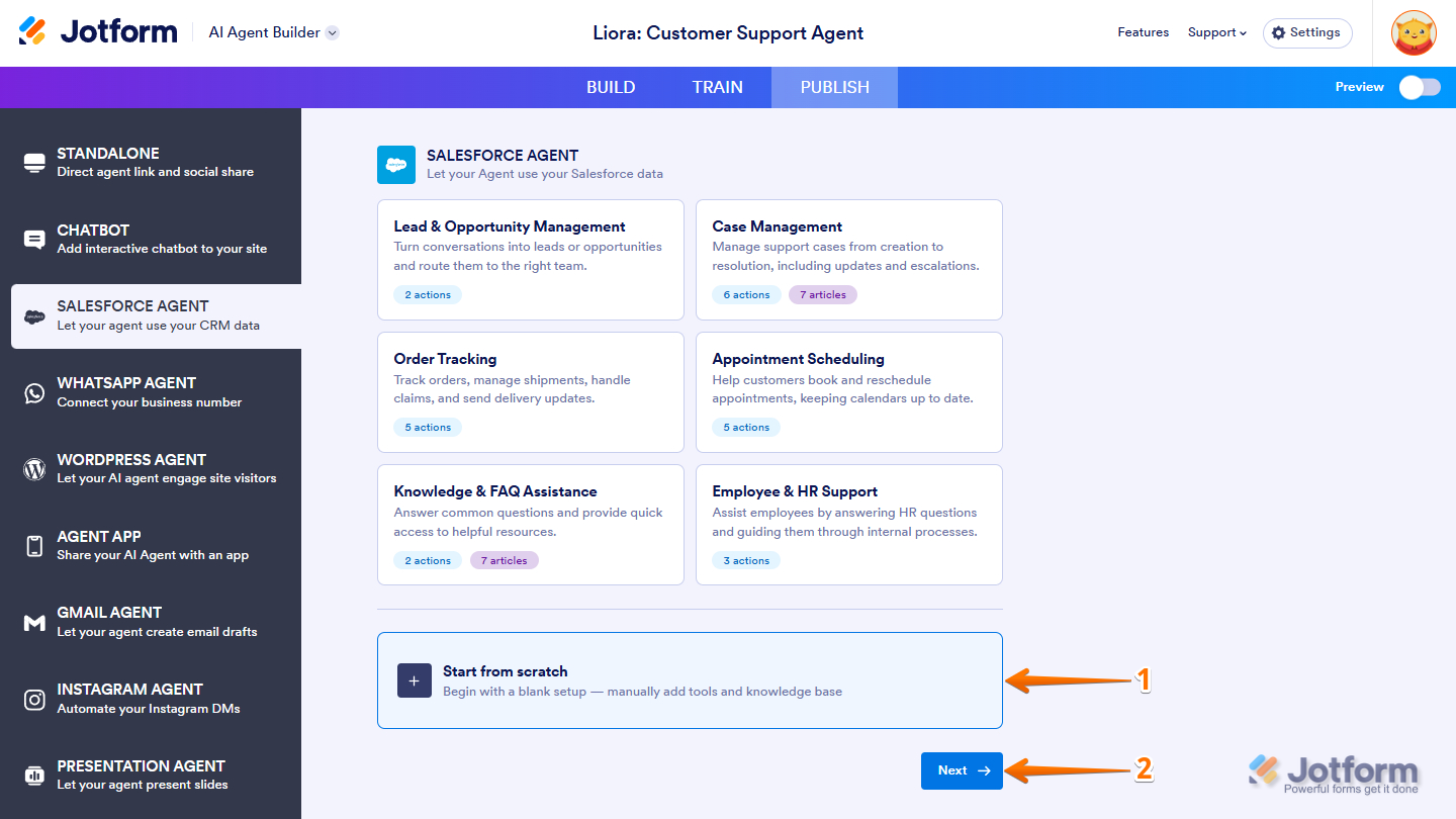 - Connect your Salesforce Agent, and on the next page, select Start From Scratch.
