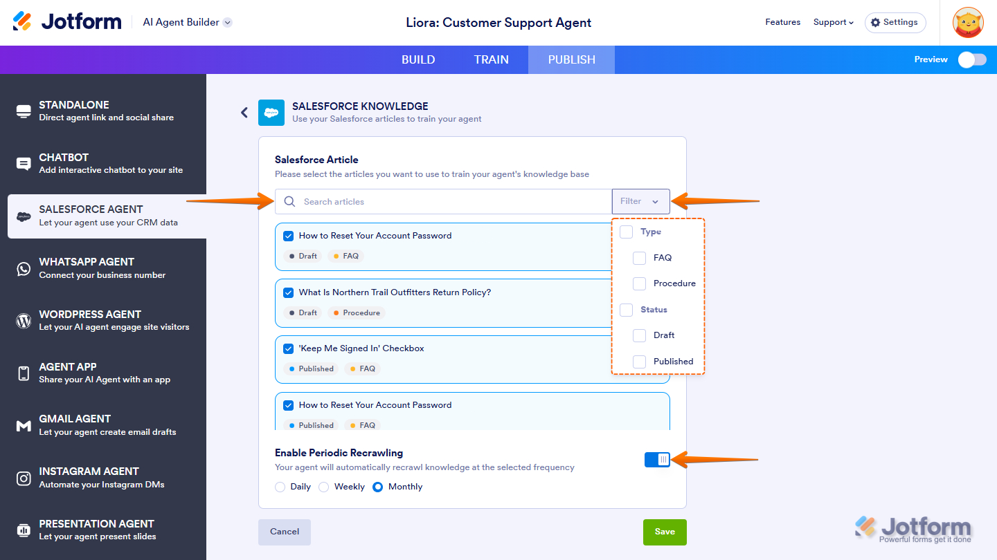 - Enable Periodic Recrawling — Toggle this on to automatically refresh your Knowledge Articles on a daily, weekly, or monthly schedule. This keeps your agent up to date with the latest versions of them, so you don’t have to re-add them manually each time.