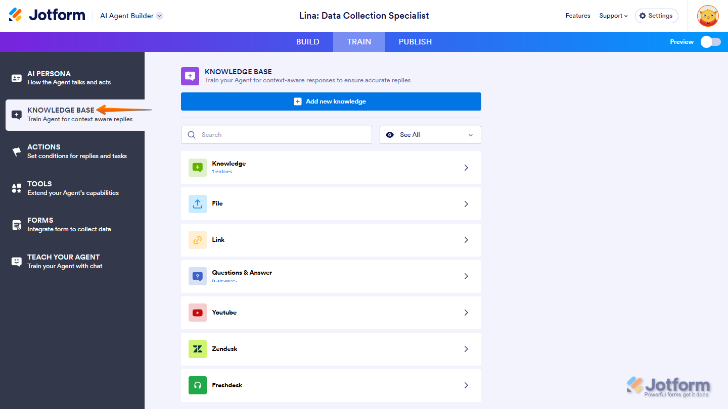 All training data gets added to your AI Agent’s overall knowledge base. You can check everything in the Knowledge Base section under the Train tab.