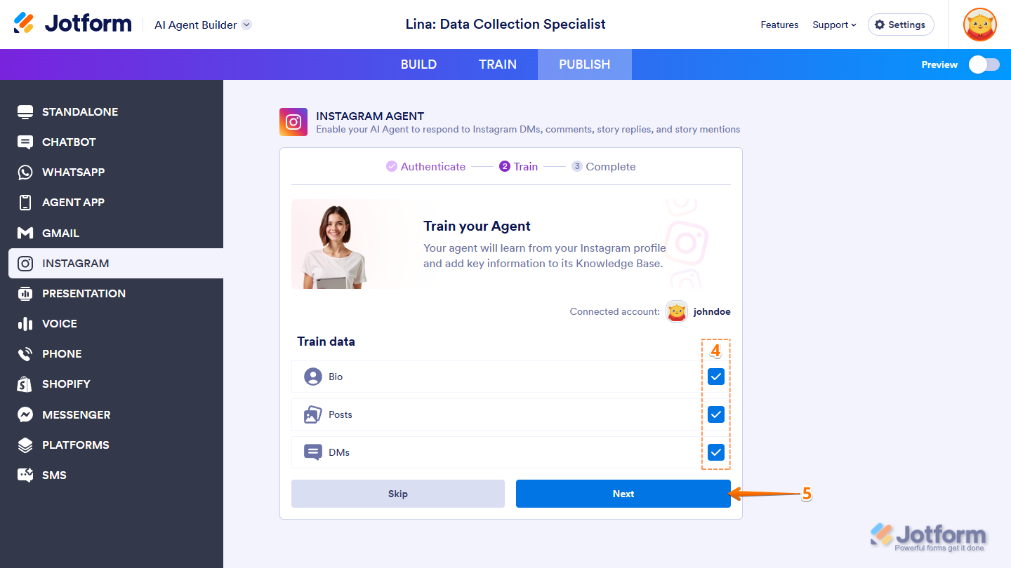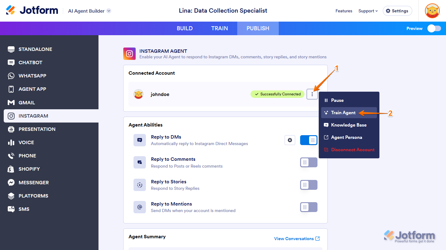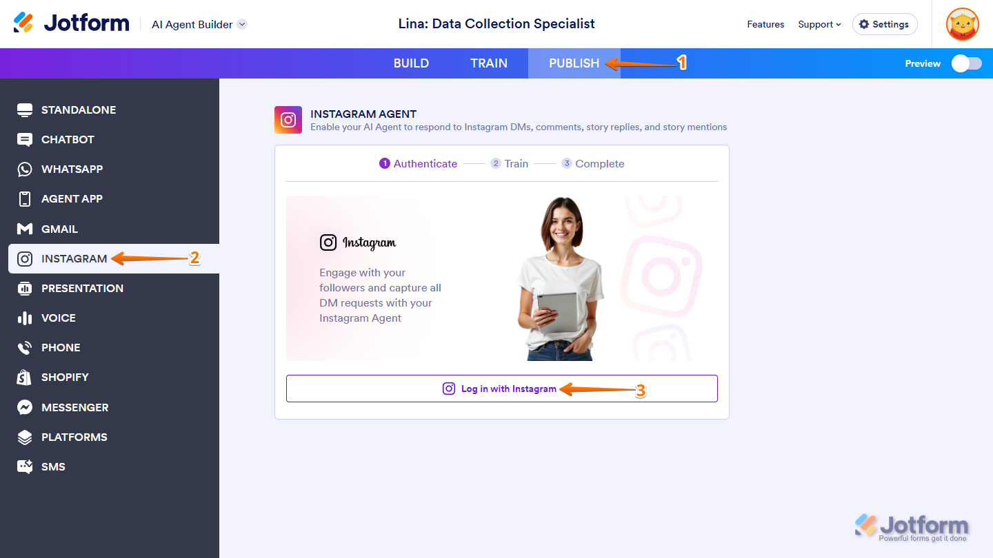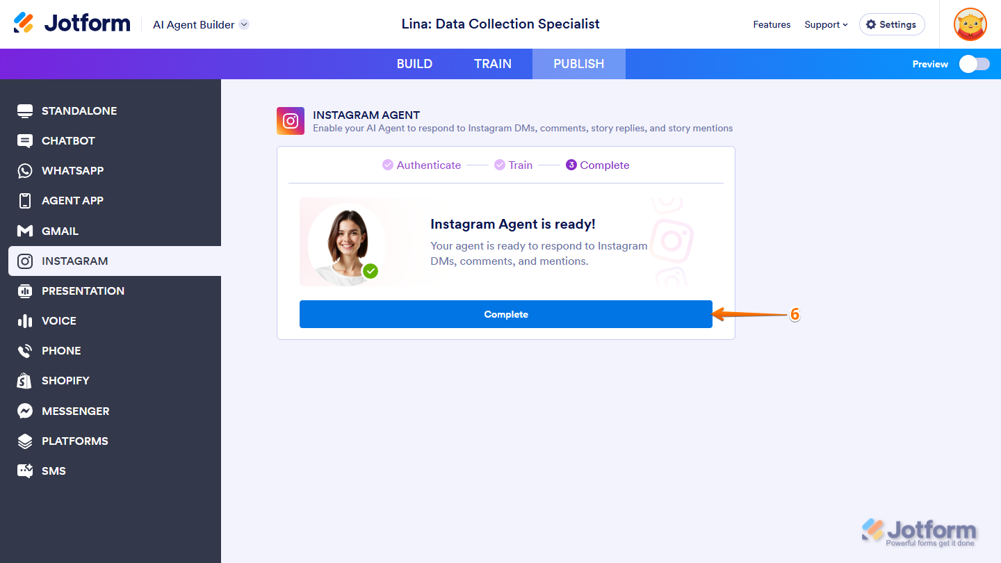 Keeping up with Instagram DMs, comments, and replies can feel overwhelming, especially when you’re answering the same questions again and again. Jotform’s Instagram Agent takes that weight off by handling repetitive messages, replying in real time, and keeping every response in line with your brand’s voice. It’s like having a teammate who never misses a message.