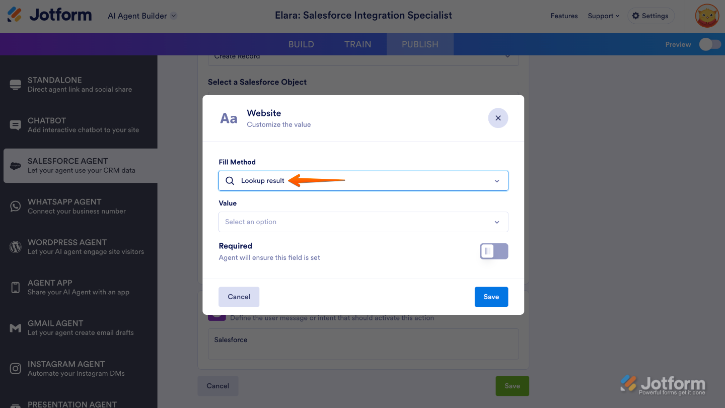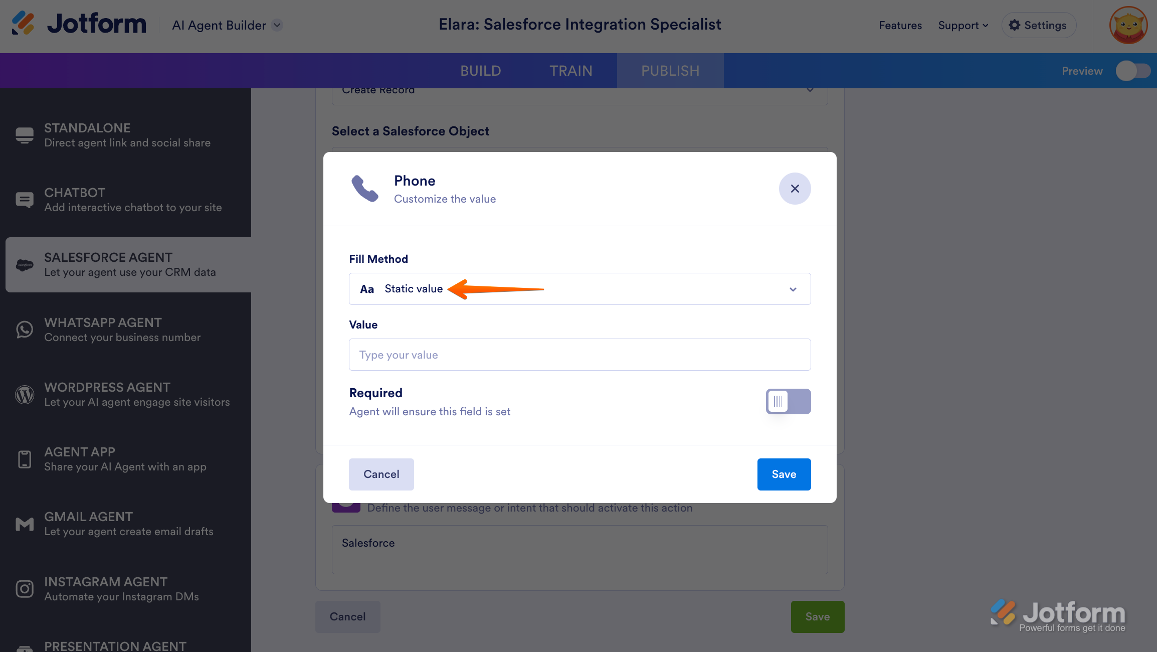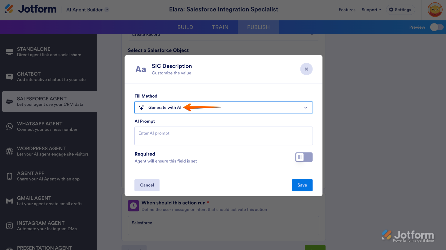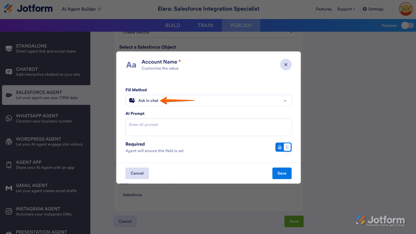 Jotform’s Salesforce Agent helps you make the most out of your Jotform AI and Salesforce integration. When setting up your Salesforce Agent Actions, you can decide how it fills in information during conversations—making it easier to collect, manage, and update data automatically. These options let your agent respond intelligently while keeping your Salesforce records accurate and up to date.