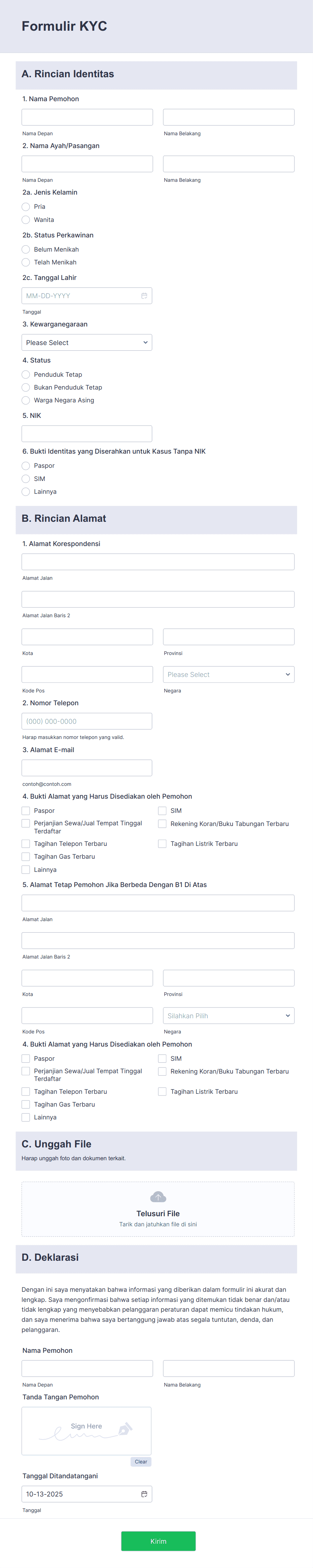 - KYC Forms: Emphasize identity verification, document uploads, and declarations.