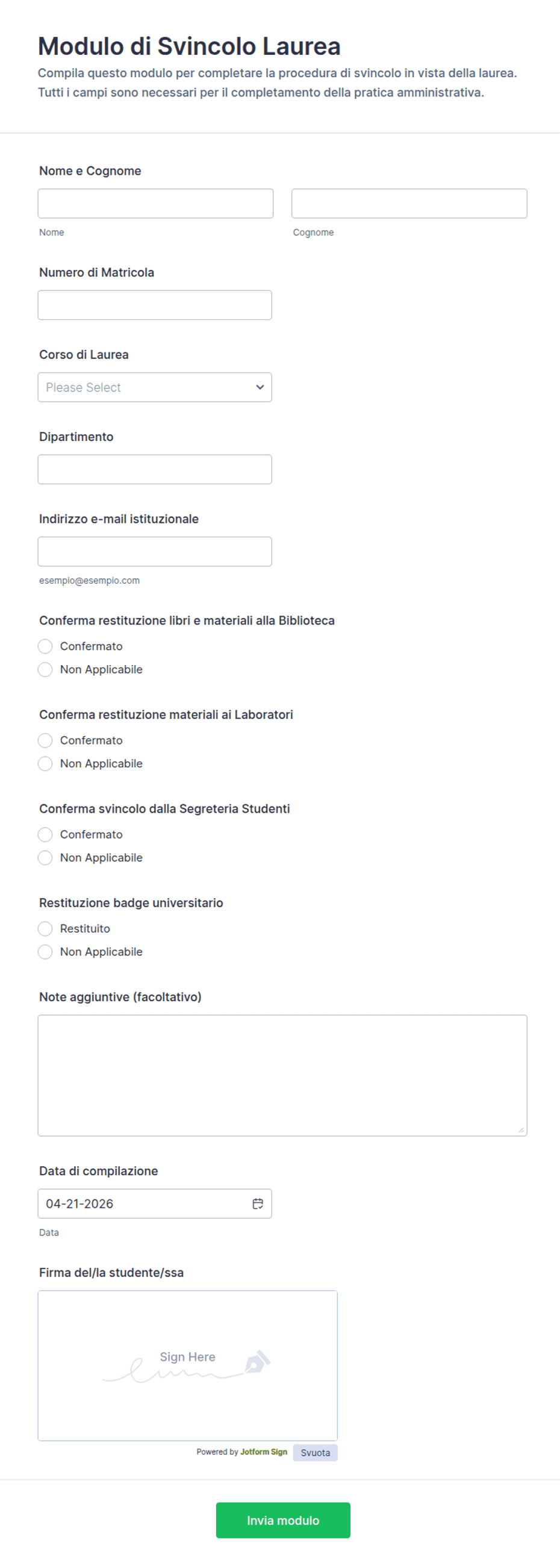 Sì. I moduli possono essere personalizzati utilizzando la logica condizionale e i campi personalizzati per riflettere diversi tipi di laurea, dipartimenti e requisiti di laurea.