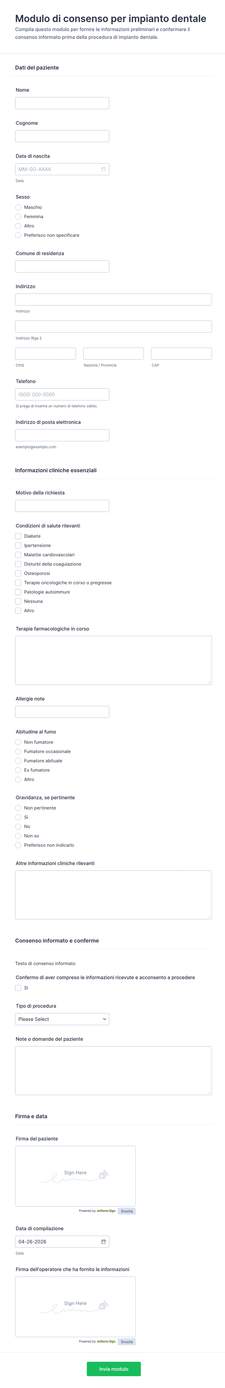 Raccogli conferme e informazioni cliniche dichiarate prima di un percorso implantologico con il Modulo di consenso per impianto dentale di Jotform, ideale per studi dentistici e cliniche che gestiscono la raccolta dati online.
