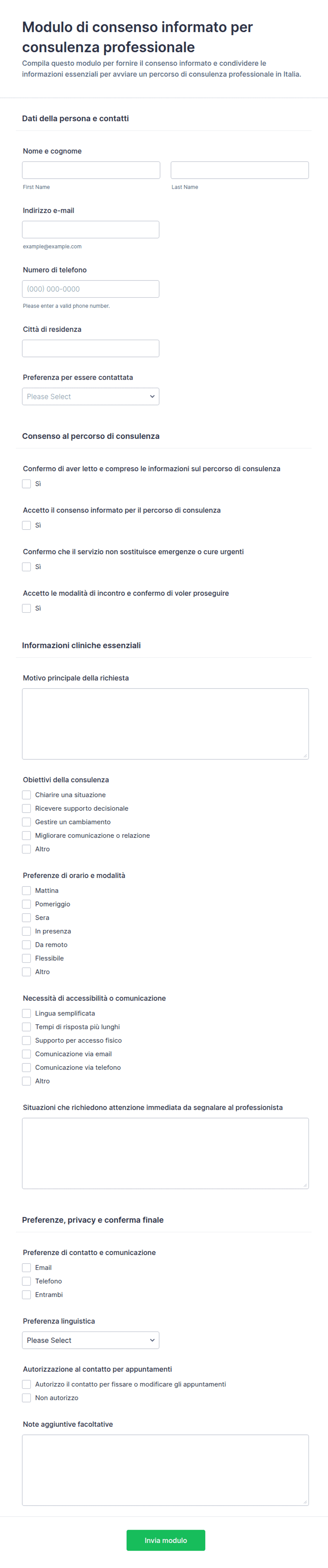 I moduli di consenso informato sono documenti essenziali utilizzati per garantire che gli individui comprendano e accettino volontariamente di partecipare a una specifica attività, procedura o studio di ricerca. Questi moduli sono comunemente utilizzati in ambito sanitario, negli studi clinici, nella ricerca accademica, nella consulenza e persino in contesti educativi o aziendali in cui vengono raccolti dati sensibili o vengono eseguite procedure specifiche. Lo scopo principale di un modulo di consenso informato è comunicare chiaramente la natura, i rischi, i benefici e le alternative di un'attività proposta, consentendo ai partecipanti di prendere decisioni consapevoli. Le applicazioni vanno dai trattamenti sanitari e test psicologici alle autorizzazioni per l’uso di immagini, la partecipazione a eventi e la raccolta di dati per la ricerca.