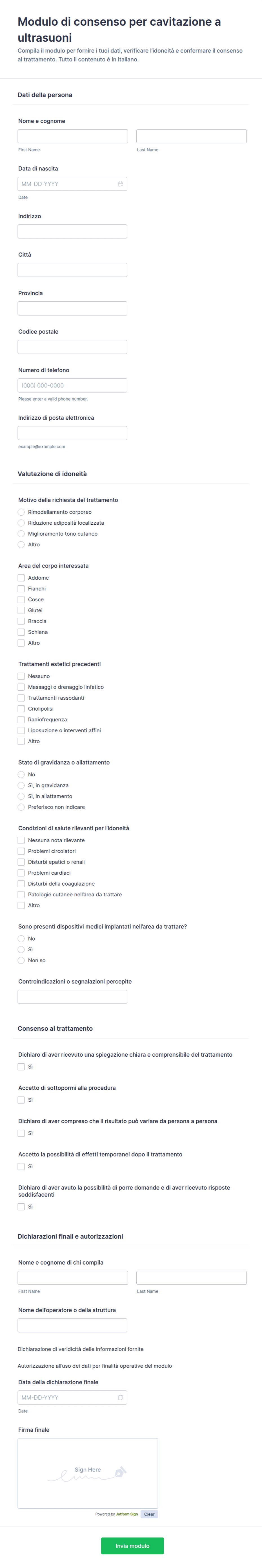 Raccogli il consenso informato per trattamenti di ulterapia con Jotform e gestisci raccolta dati, firma del paziente e invio del modulo in un unico modello di modulo pronto da personalizzare per studi e centri estetici.