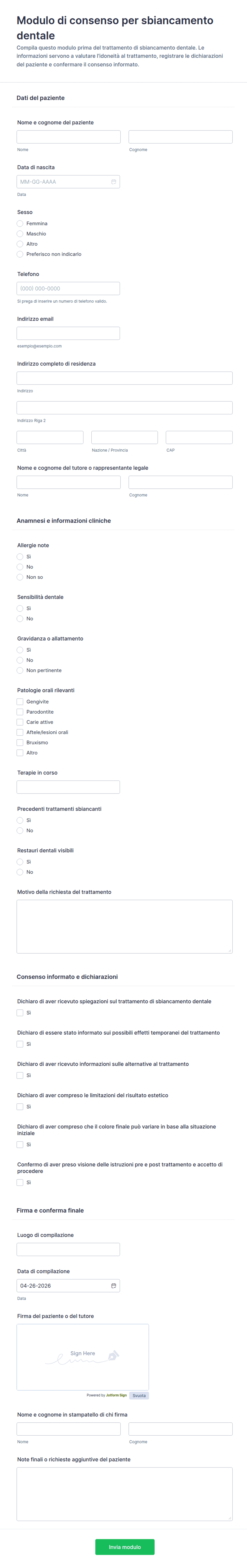 Raccogli il consenso informato per trattamenti odontoiatrici con un modello di modulo Jotform, utile per studi dentistici e cliniche per gestire autorizzazioni, firme e data collection online in modo ordinato.