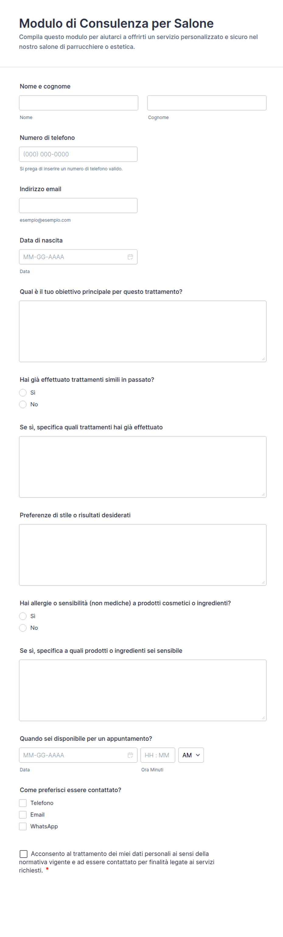 I moduli dei saloni di bellezza aiutano a semplificare le operazioni, ridurre la burocrazia, minimizzare gli errori di prenotazione e garantire che tutte le informazioni necessarie vengano raccolte per un'esperienza cliente sicura e personalizzata.