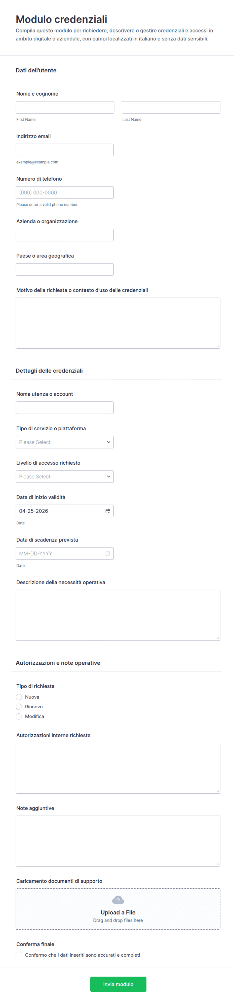 Raccogli il nome del richiedente, il reparto, le informazioni di contatto e il tipo di accesso (fisico, di sistema, visitatore). Includi il motivo dell'accesso e le date richieste.