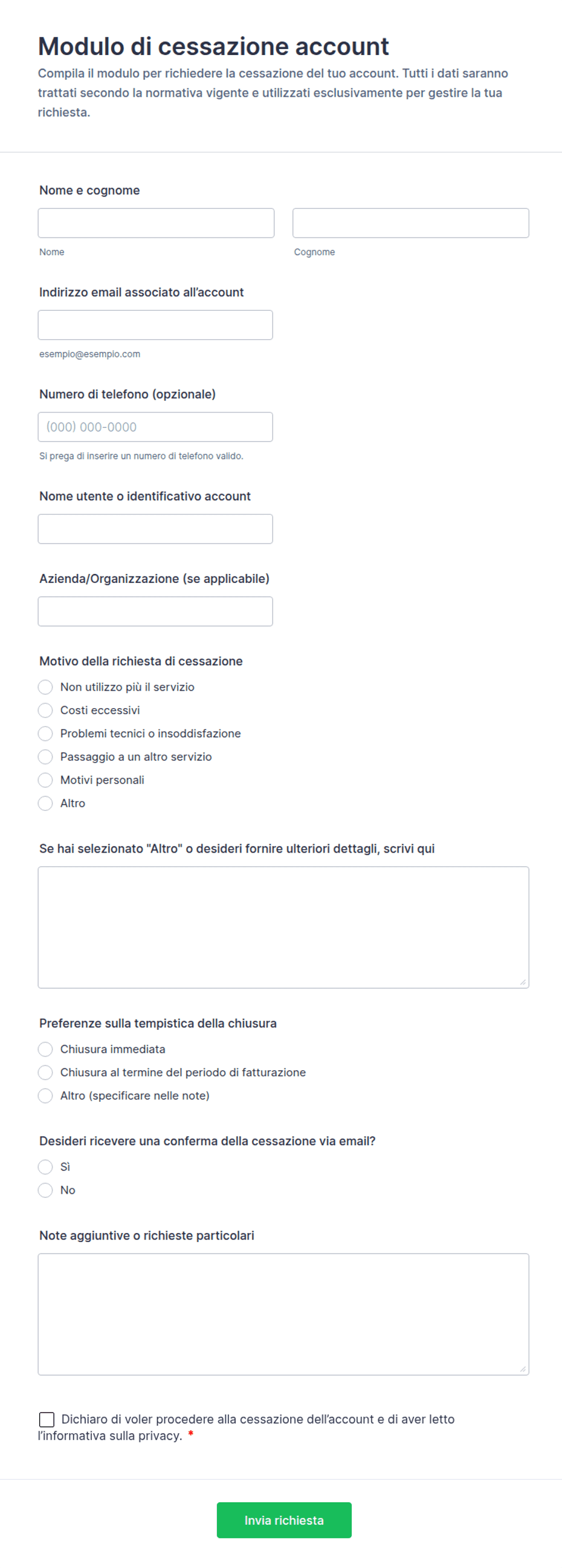 - I campi obbligatori possono essere diversi: informazioni di contatto, motivo della disdetta, data dell'ultimo servizio, feedback e consenso ai termini.
