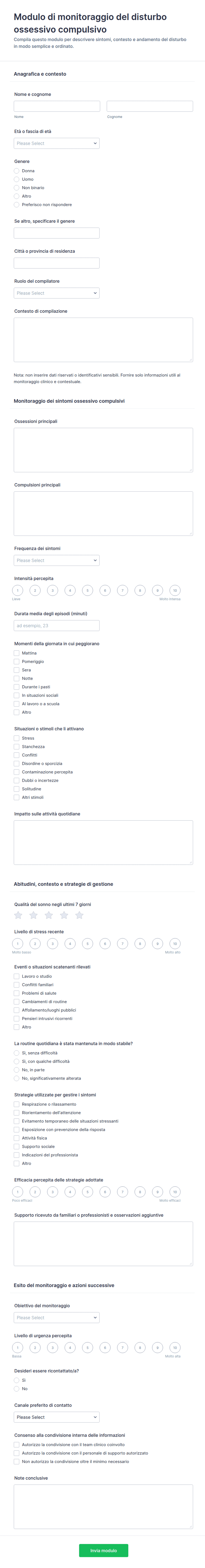 Aggiungi sezioni per preoccupazioni o obiettivi, descrizioni dei sintomi, durata e impatto sulla vita quotidiana. Utilizza scale di valutazione o domande a risposta multipla per valutare i livelli di umore, stress o ansia e includi campi di testo libero solo quando è utile un contesto aggiuntivo.
