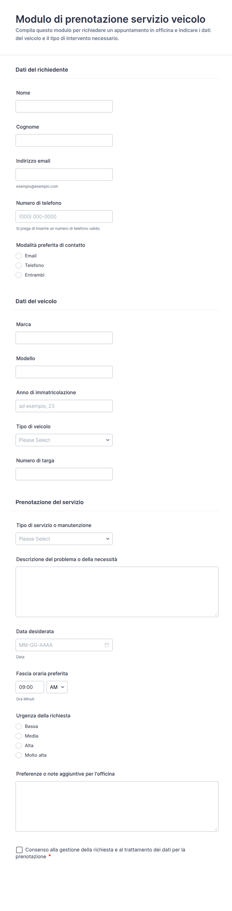 Un modulo di prenotazione servizi è un modulo online che consente ai clienti di pianificare appuntamenti, prenotare servizi o risorse presso un'azienda o un'organizzazione.