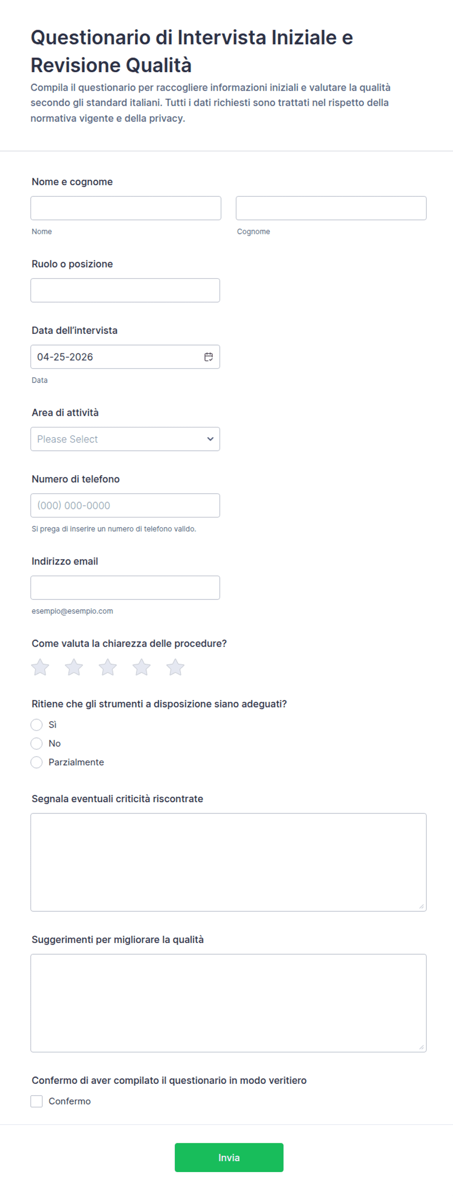 I modelli online semplificano la raccolta dei dati, riducono gli errori di inserimento manuale, abilitano l'analisi in tempo reale e facilitano la distribuzione e la gestione delle risposte.