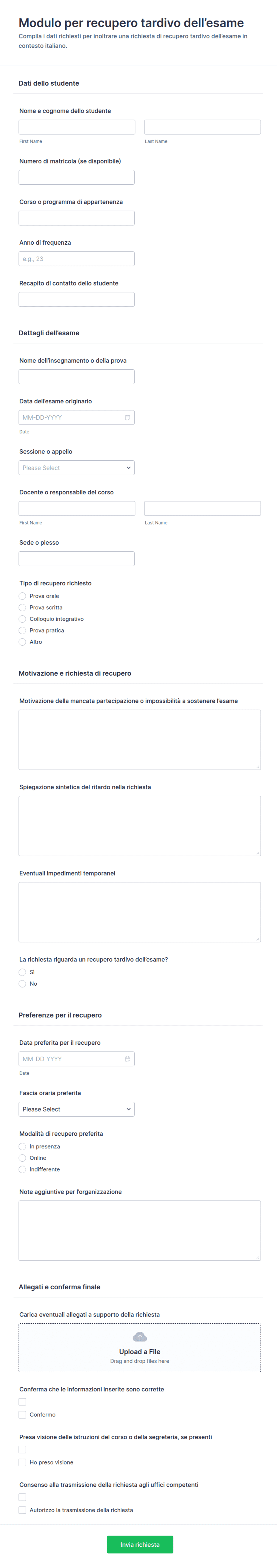 I moduli d'esame di solito raccolgono i dati identificativi dello studente, le risposte a vari tipi di domande (scelta multipla, risposta breve, saggi) e talvolta i consensi o altre informazioni.