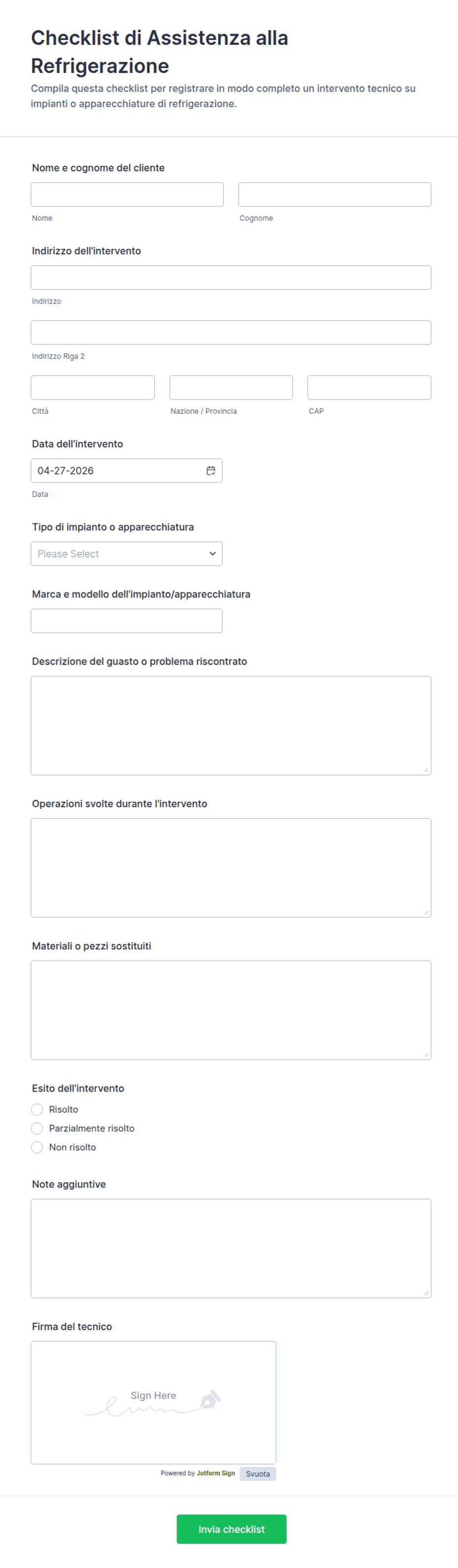 Includi campi di caricamento file per foto, fatture, note tecniche o documenti del fornitore di servizi.