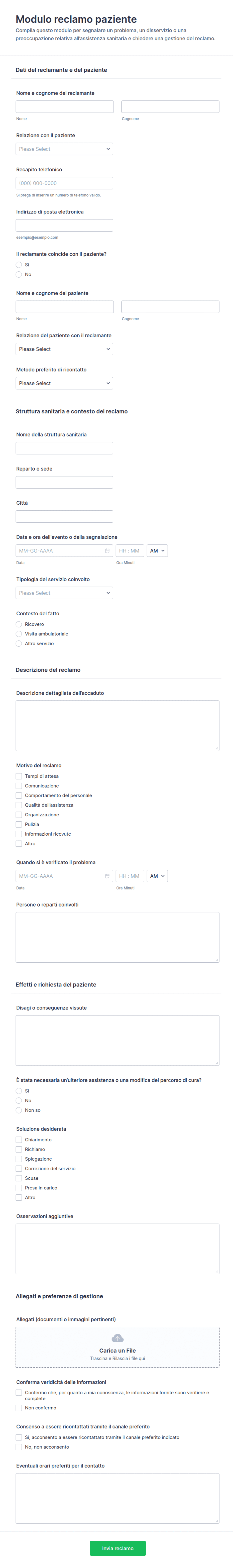 - Logica Condizionale: Alcuni campi potrebbero apparire solo se vengono selezionate opzioni specifiche (ad esempio, tipo di reclamo).