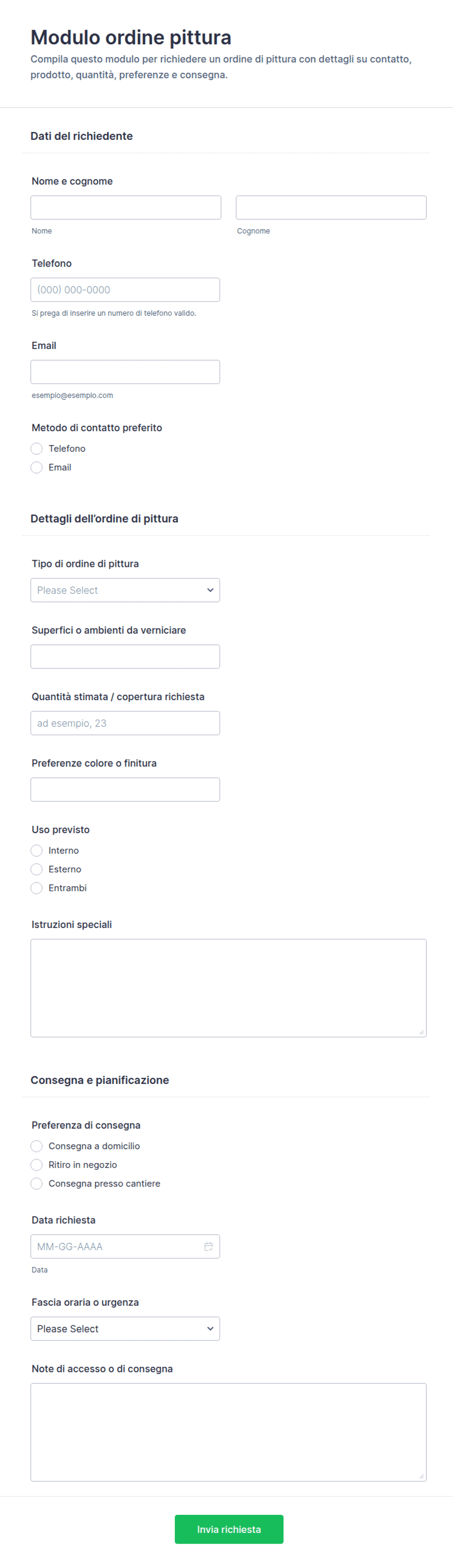 - Indirizzo di consegna, data di consegna preferita, e dettagli del fornitore